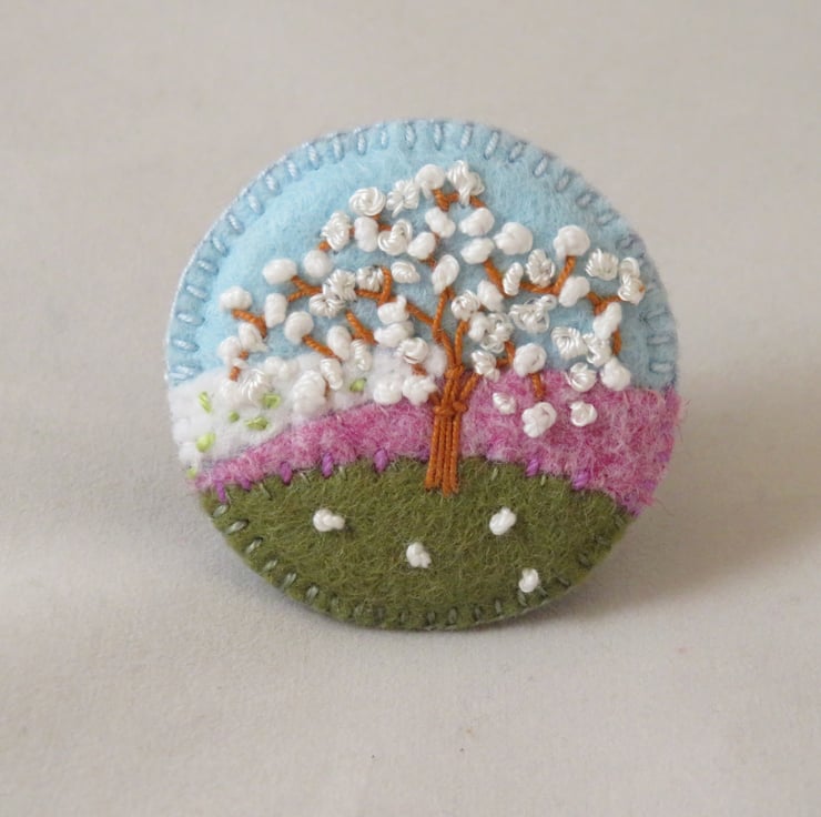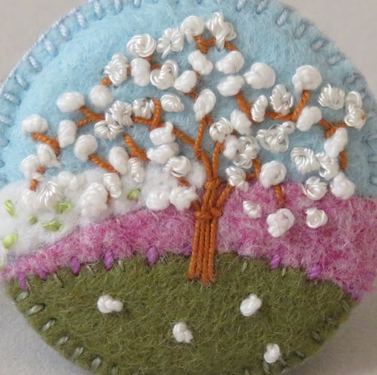 The background of the brooch has been created from felt. The tree has been stitched in cotton threads using simple embroidery stitches. The blossom has been stitched in white threads - one of which is a vintage thread with a lovely sheen.