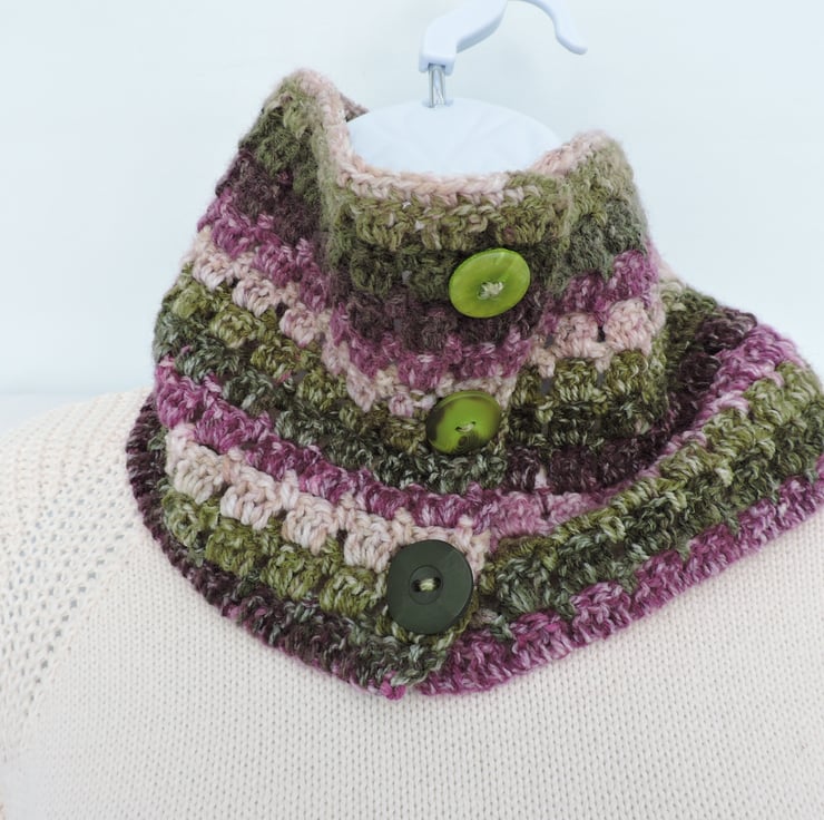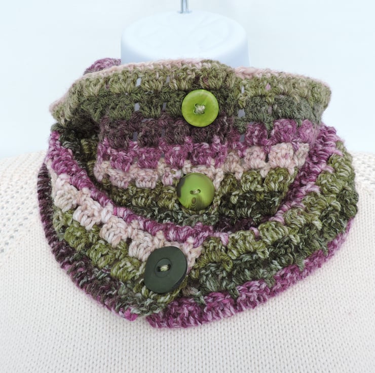 This adults neck warmer scarf has been crocheted with a soft acrylic double knit self striping yarn. The colourway is pink, purple, olive green and sage green.. It has three olive green buttons which do up making the neck warmer size adjustable.