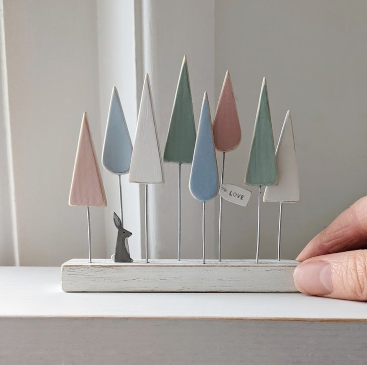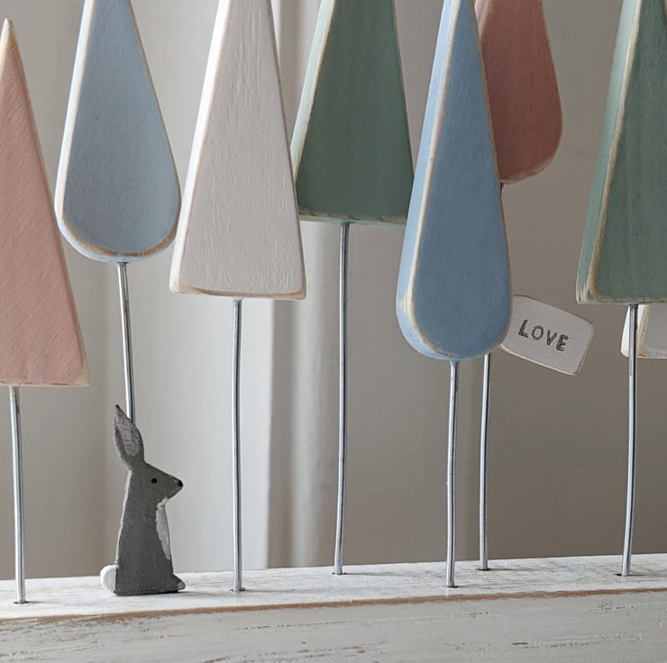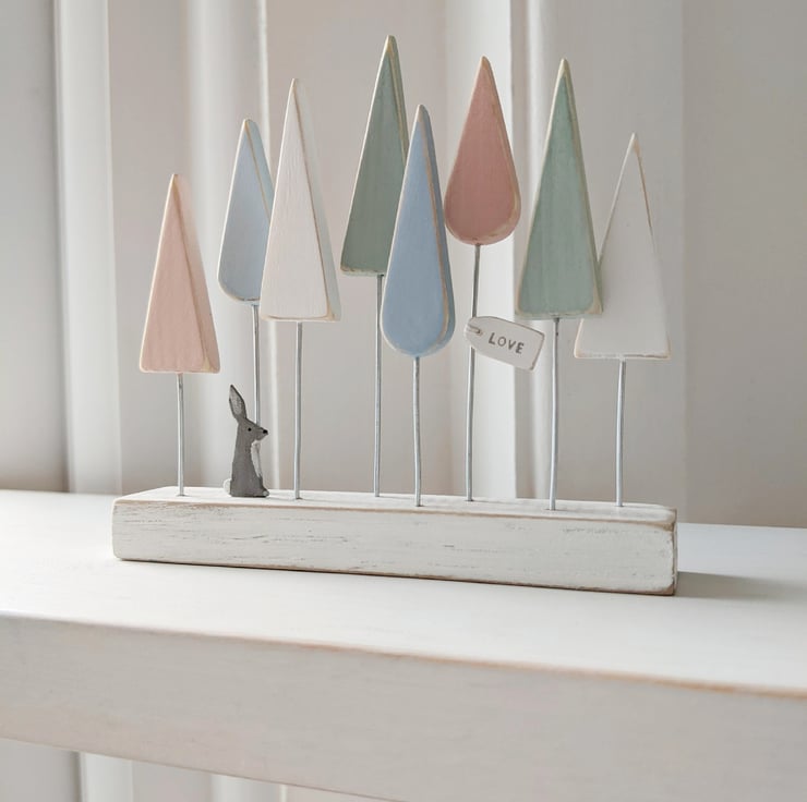 This group of wooden trees is hand-painted in pretty pastel shades of pink, blue, green and off white. A tiny sitting hare admires the view, and a little wooden sign hangs from one of the trees with the word love stamped on it.