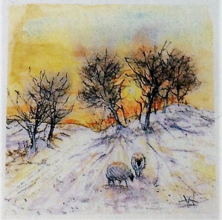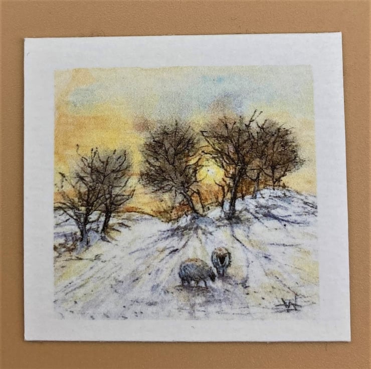 Winter sunsets on a snowy day are just spectacular with the leafless trees silhouetted against the glowing sky. In Herefordshire where I live I often see sheep in the snowy fields - their thick wooly fleece gives them great protection against the winter frosts. A quick sketch in the icy air is all I can manage on a cold day but later in a warm studio I can paint and create at leisure. The golden evening light makes this a really colourful print.