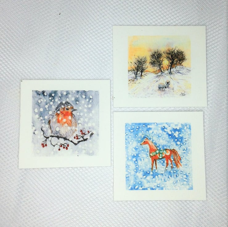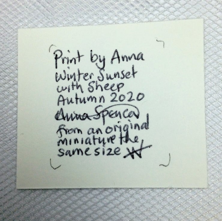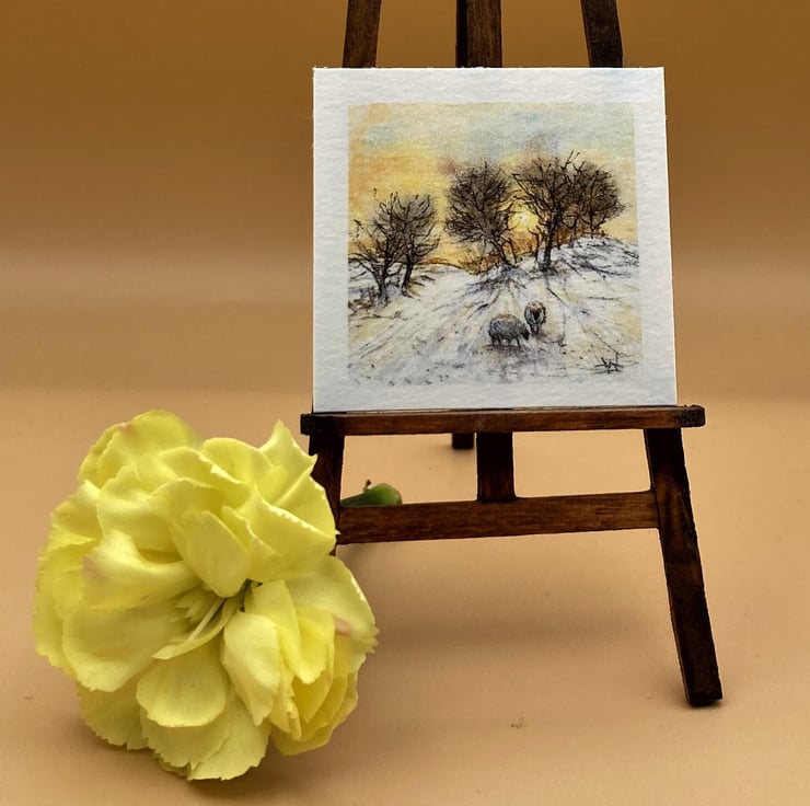 This tiny UNFRAMED PRINT is a dolls house 1:12th miniature of sheep in a Winter landscape. It is reproduced at exactly the same size as the original painting which was approximately 3.5 x 3.5 cm square (about the same size as a large postage stamp). The picture shows a snowy winter landscape with sheep, in the background trees stand out against a colourful golden sunset.