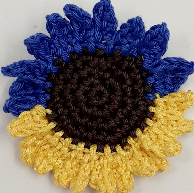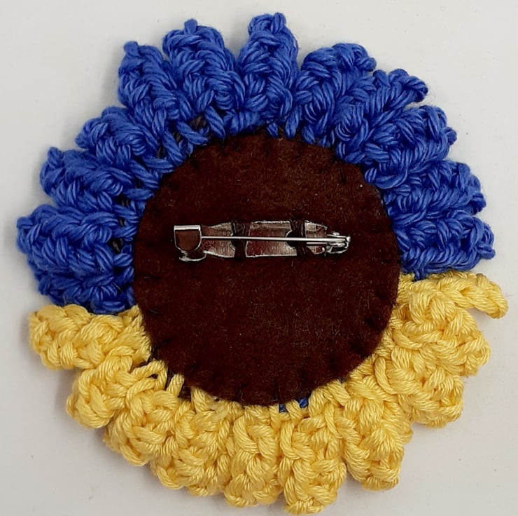 This sunflower brooch is crocheted in cotton. The centre is dark brown and the petals are as close to the colours of the ukranian flag as I can make them. The metal pin is firmly attached to a circle of brown felt on the back. The sunflower measures approximately 8 cm in diameter and comes to you in protective cardboard packaging.