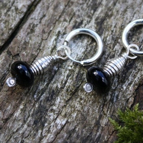 Handmade sterling silver forged pins are combined with onyx roundel beads and fine silver Hill Tribe bi-cones. They have a subtle semi-oxidised finish.
