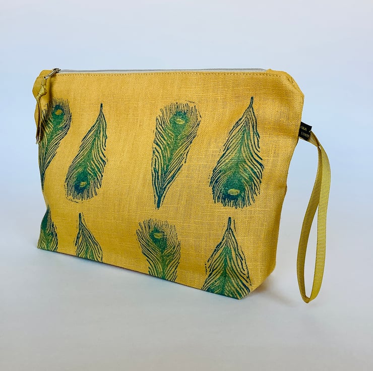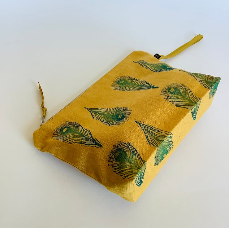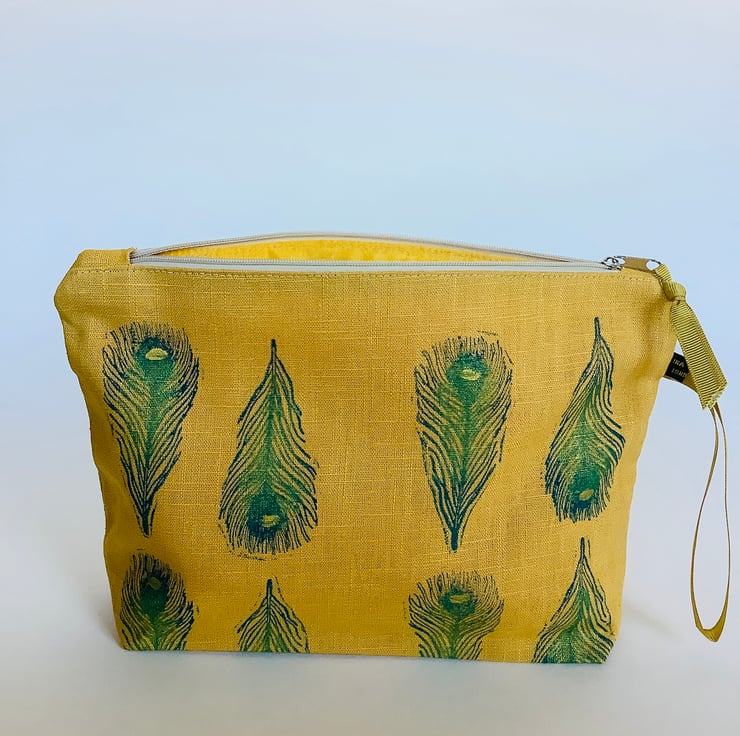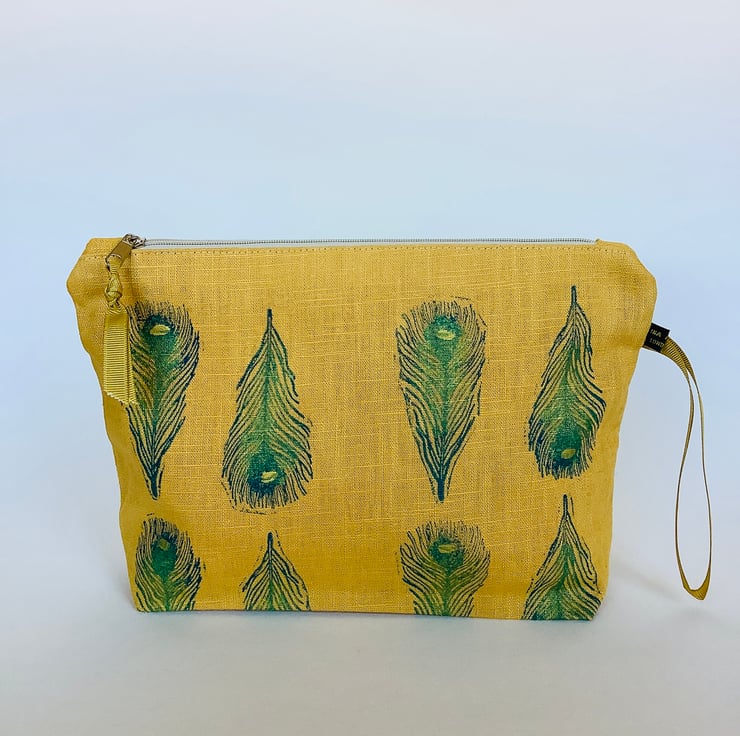 Stylish hand printed Makeup Bag featuring Peacock Feathers design on the front, made in gold yellow naturally sourced eco-friendly 100% linen, perfect for keeping all your daily essentials like makeup, sunglasses, phone etc safely stored in one place. This Makeup Bag is your new everyday essential, perfectly sized to fit in your handbag or suitcase.