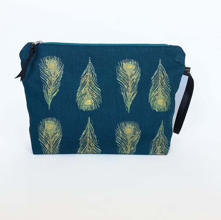 Linen Makeup Bag Peacock Feathers Print; Hand printed Clutch Bag