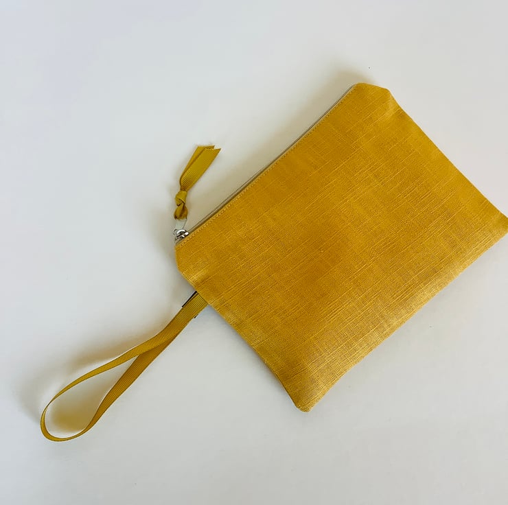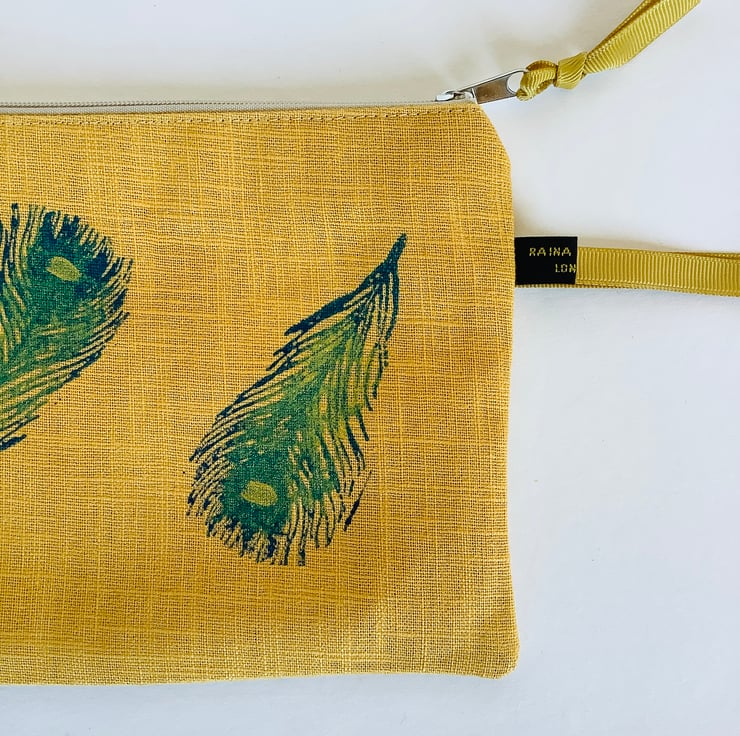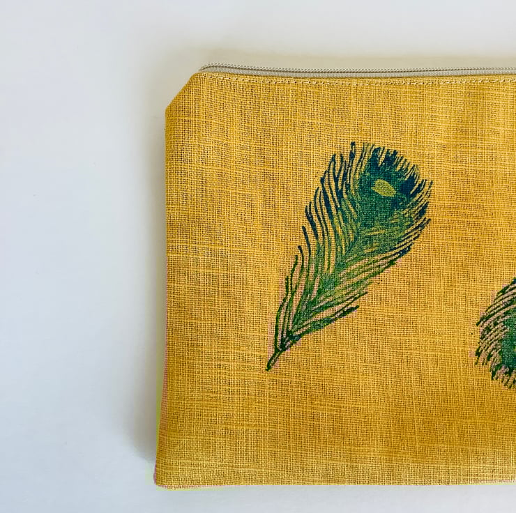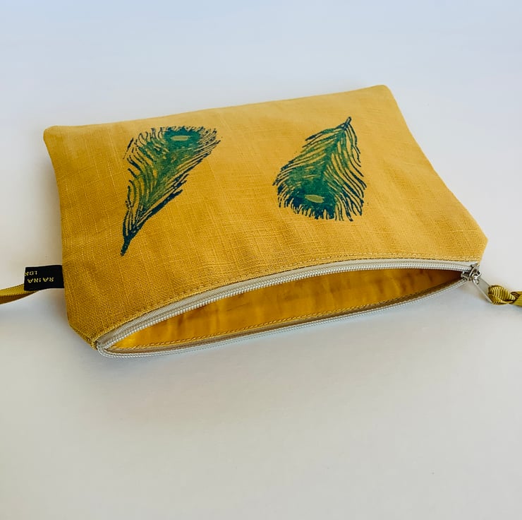 These stylish hand printed pouches made in gold yellow naturally sourced eco-friendly 100% linen are perfect for keeping all your daily essentials like makeup, sunglasses, phone etc safely stored in one place. Small enough to fit in your handbag they also makes a lovely handmade gift or can also be used as a pencil case.