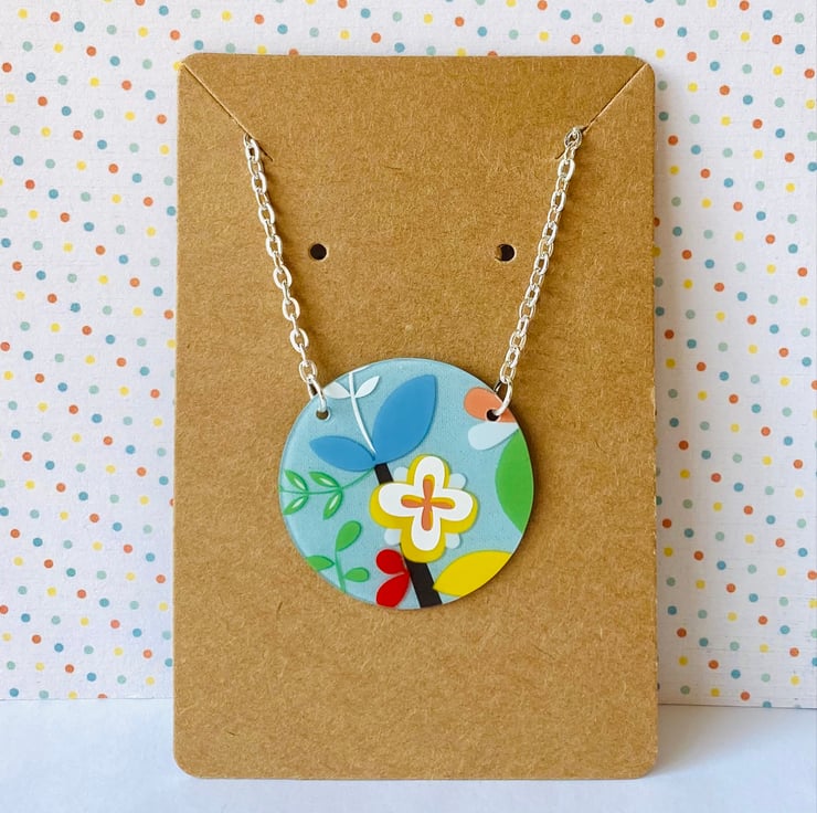 This pretty floral disc pendant has been hand cut from a plastic Starbucks gift card. It has a vibrant summery theme with flowers and leaves in many different colours on a pale blue background. The chain is silver plated with a lobster clasp closure. In total the necklace measures 19 inches long.