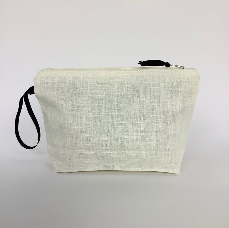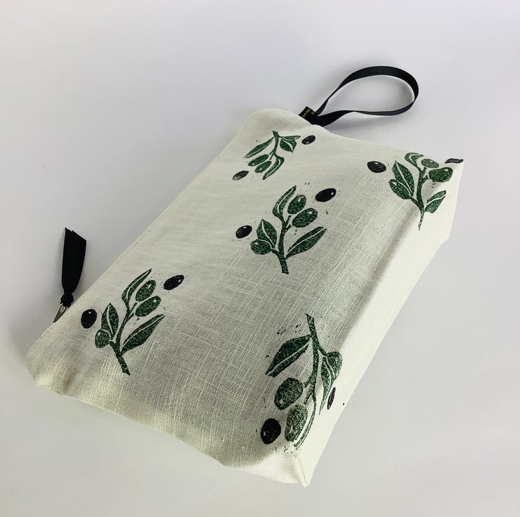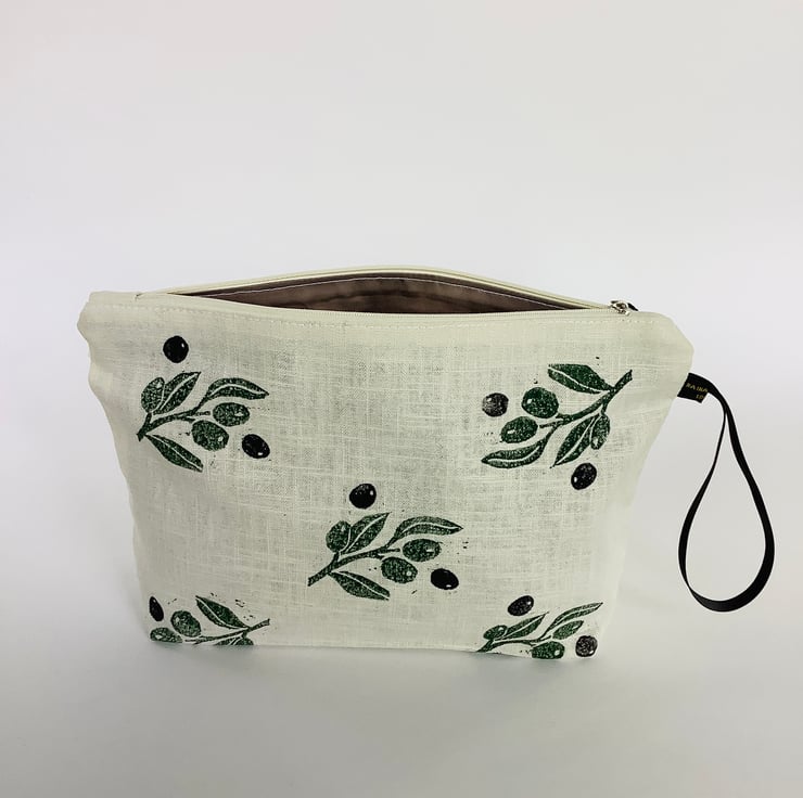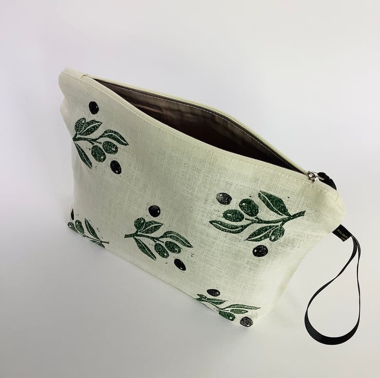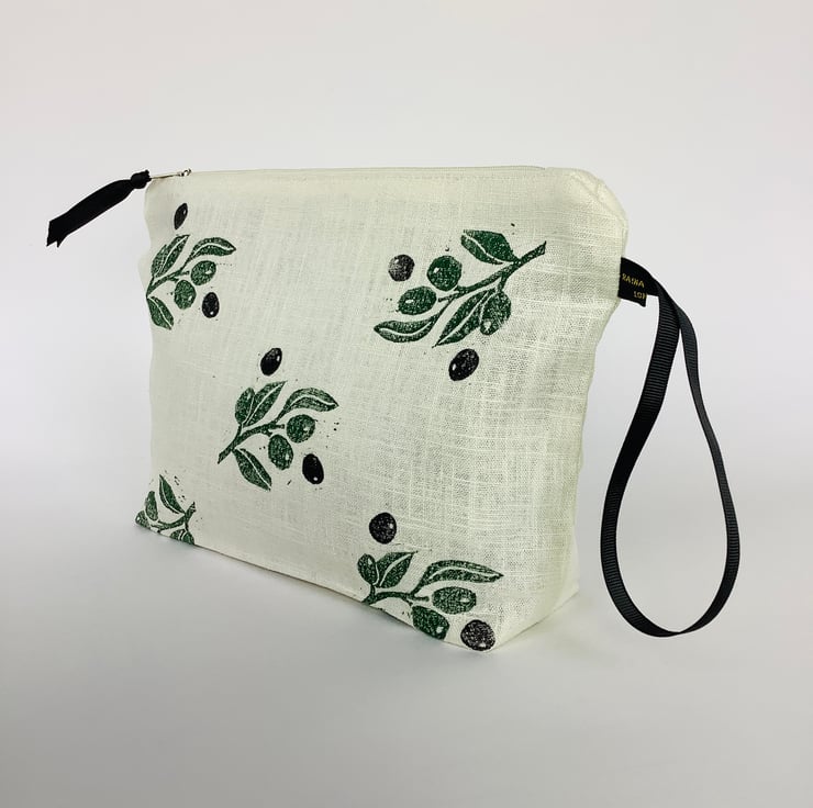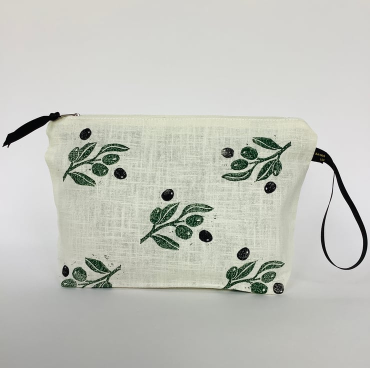 Stylish hand printed Makeup Bag featuring Mediterranean Olives design on the front, made in cream naturally sourced eco-friendly 100% linen, perfect for keeping all your daily essentials like makeup, sunglasses, phone etc safely stored in one place. This Makeup Bag is your new everyday essential, perfectly sized to fit in your handbag or suitcase.