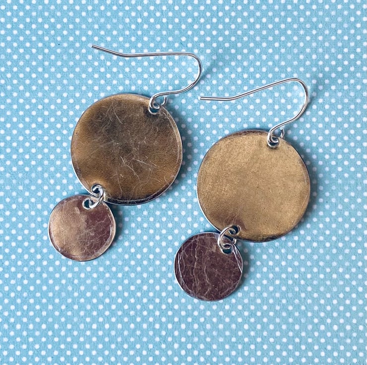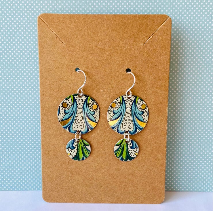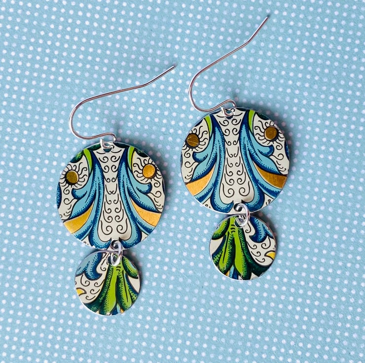 So simple and easy to wear, these earrings could be worn whether dressed up or dressed down! The two discs have been hand cut from a pretty little tin featuring an ornate floral design in blue, green and gold. They have been smoothed around the edge and joined with a silver plated ring. The ear wires are silver plated.
