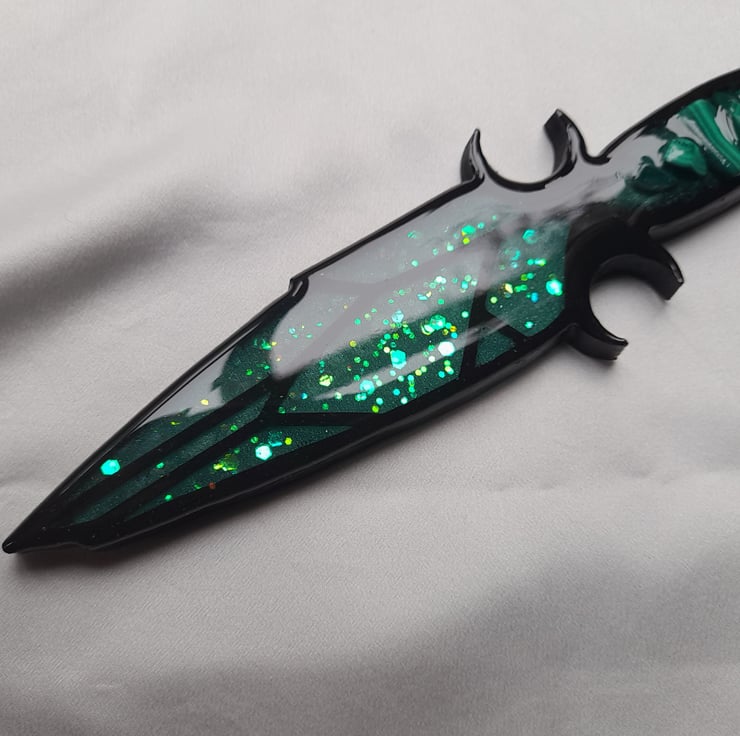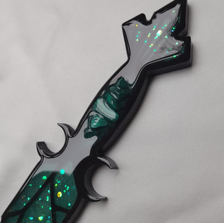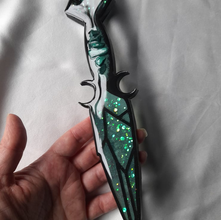 This athame dagger has been handcrafted over a period of several days using multiple layers of three different types of resin. It has been filled with love, care and good intentions.
