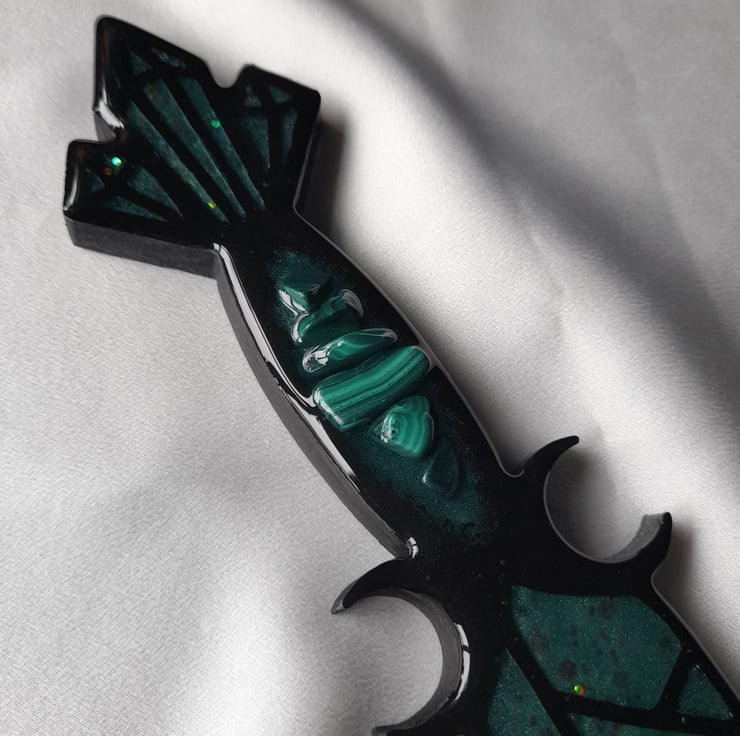 The handle of this athame has been adorned with beautiful green malachite crystals.