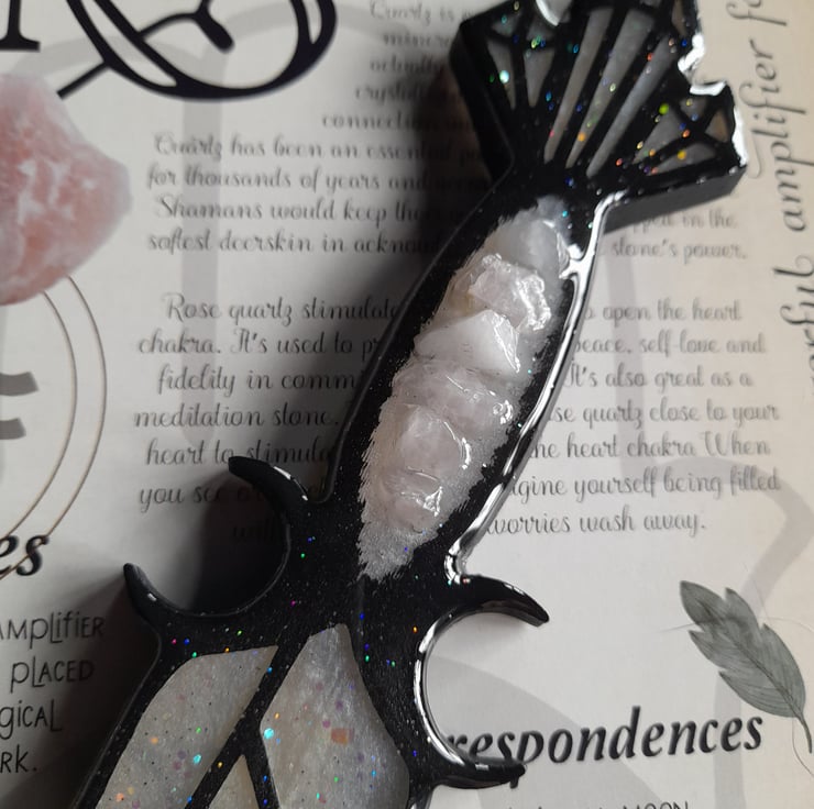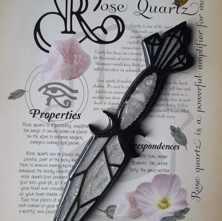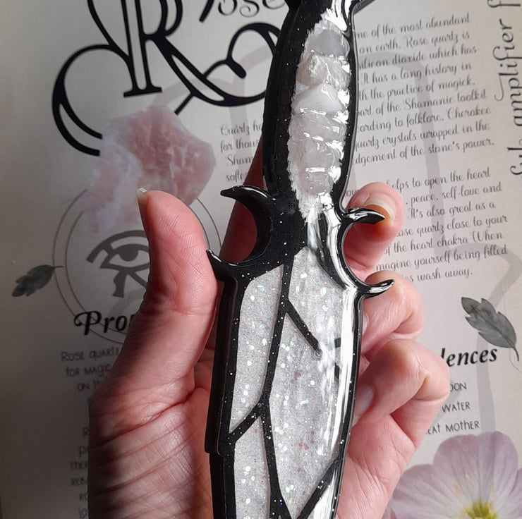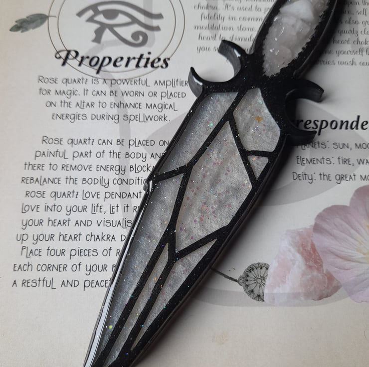 This athame has been handcrafted over a period over several days, using multiple layers of three different types of resin. It has been filled with love, care and good intentions.