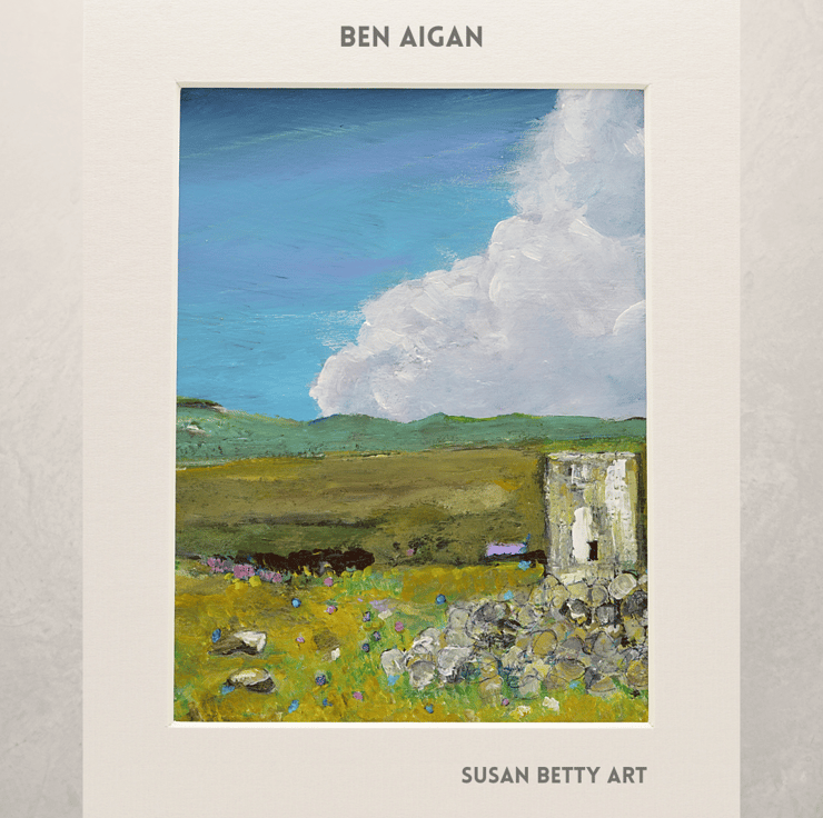 This painting is called, "Ben Aigan". It's a great climb for some magnificent views across Morayshire. This would make an ideal letterbox gift for any art lover or anyone who is interested in the landscape and the great outdoors.