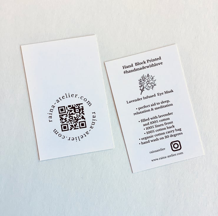 Lavender infused eye sleep mask hand printed and handmade of naturally sourced eco-friendly 100% linen, it has covered elasticated strap and is lined 100% soft cotton and is filled with padding made of 100% cotton. The edges are finished with the bias-binding tape also from 100% cotton fibers. Only natural materials are used and the mask is hand crafted and sewn from high quality breathable linen lined with one layer of soft cotton for comfort against your skin.