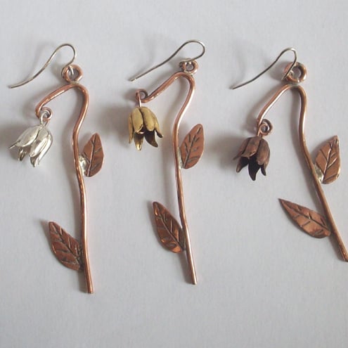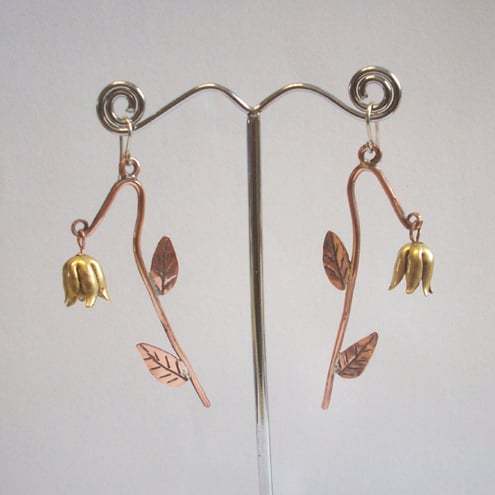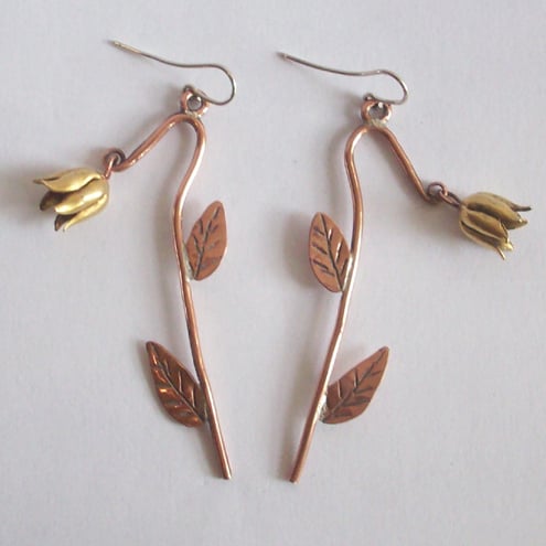 Hand-made copper twig shape earrings with gold coloured flower drop. Earwires are in sterling silver wire. Available in three colours, this is a listing for the GOLD coloured flowers Earrings are 5 cm long. Thanks for looking and for supporting hand-made!