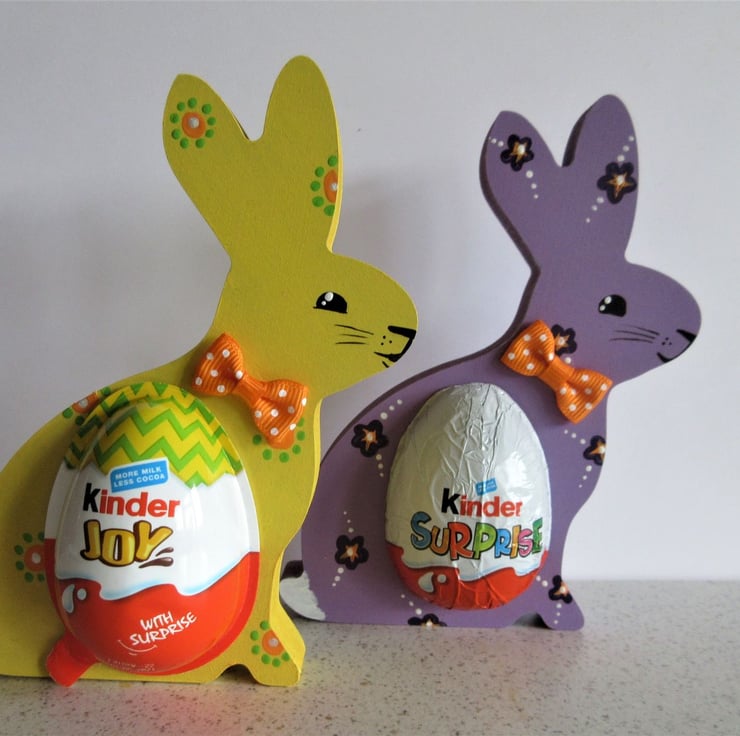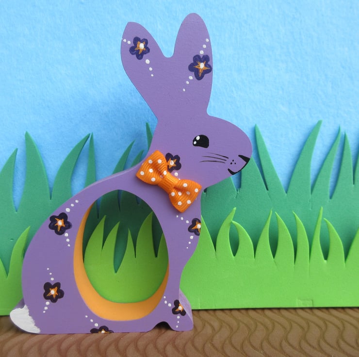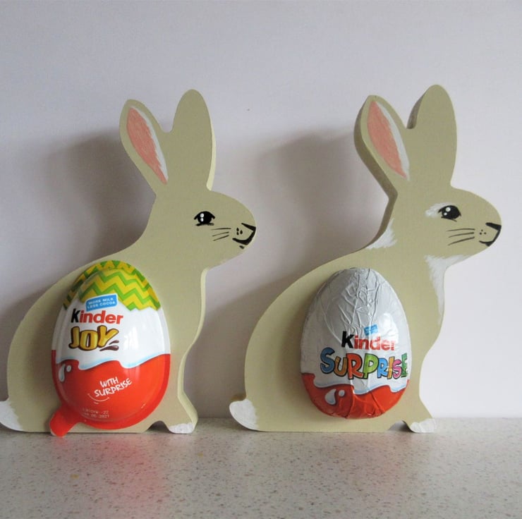 This is a freestanding MDF bunny, which holds a chocolate egg (Kinder - see photos for examples of the eggs that fit).