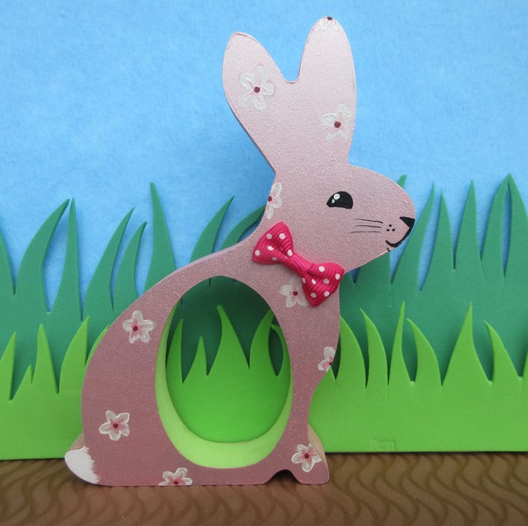 This is a freestanding MDF bunny, which holds a chocolate egg (Kinder - see photos for examples of the eggs that fit).