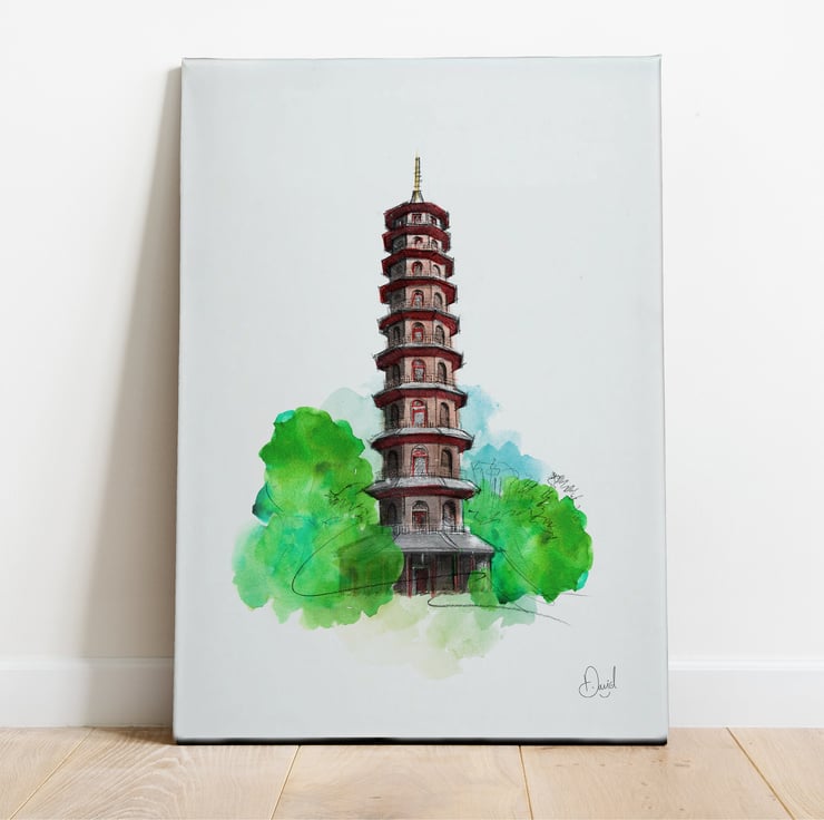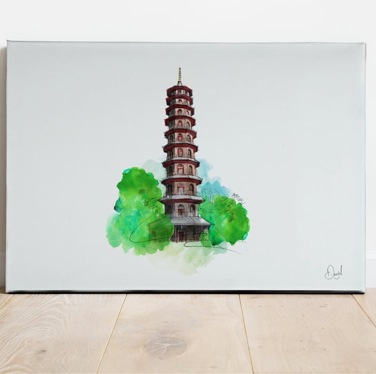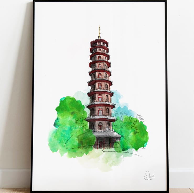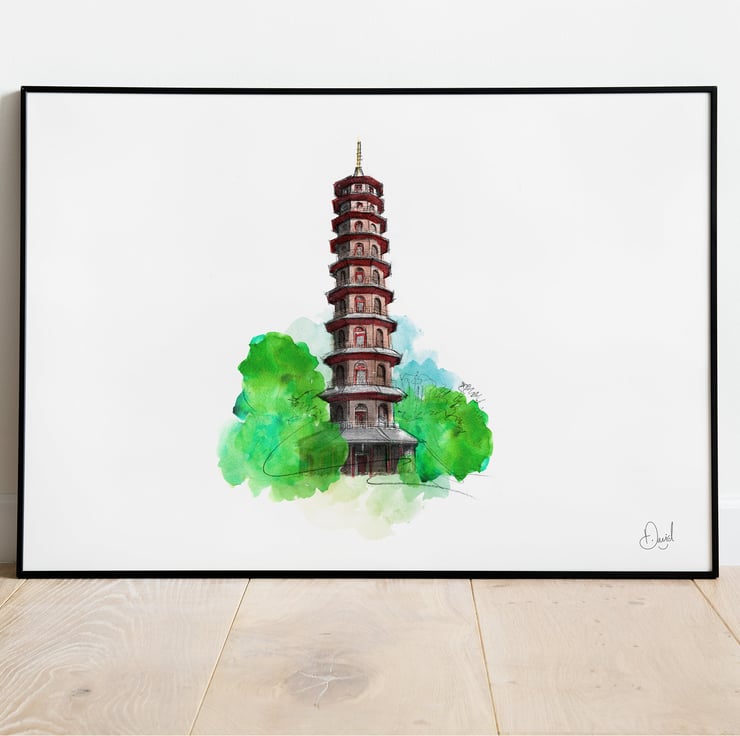 Originally created in pencil, watercolour paint and pen. This illustration of the Grand Pagoda at Kew Gardens was created as part of my 'Cities' series of Illustrations, which are all available on and my website, david-marston.com.