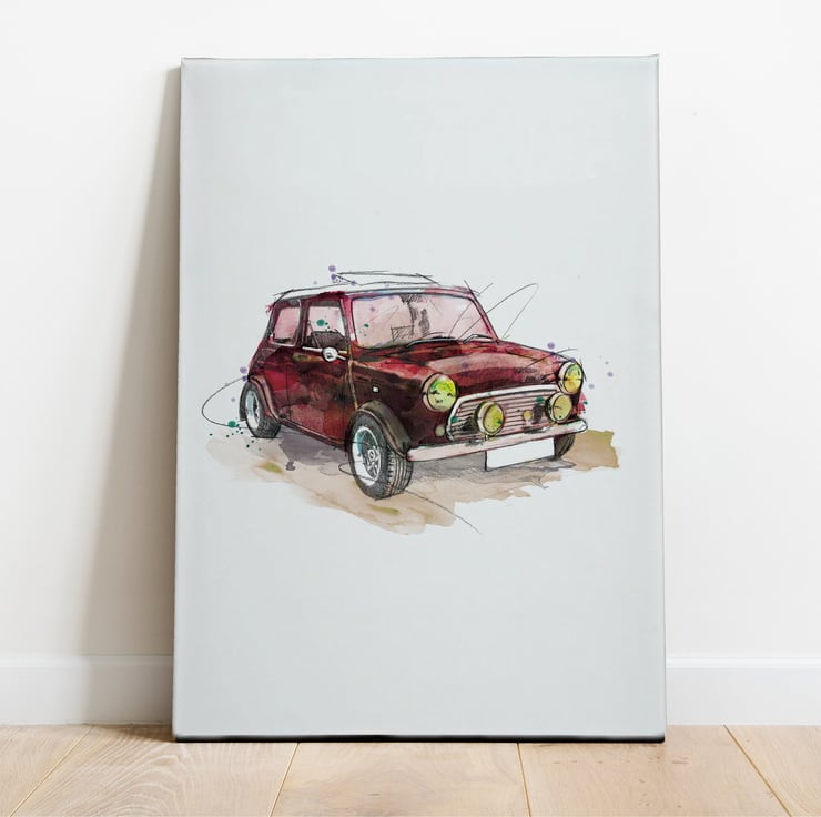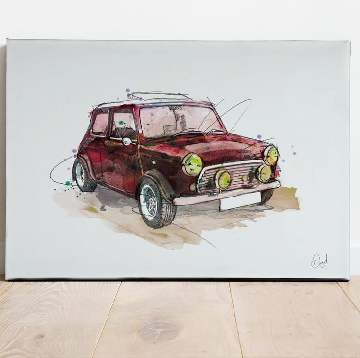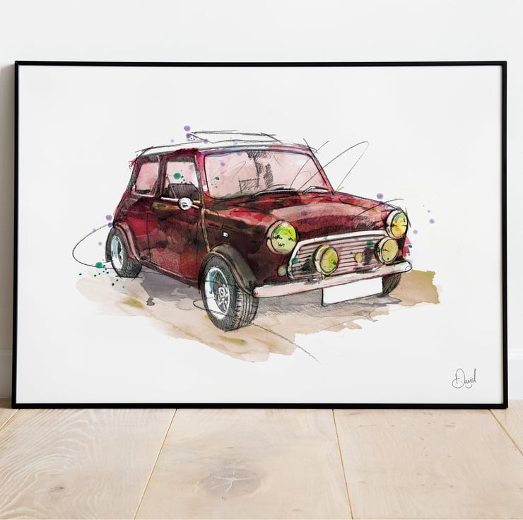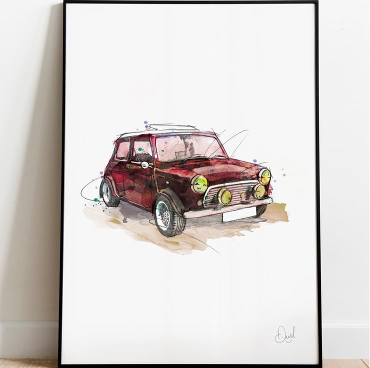 Originally created in pencil, watercolour paint and pen. This illustration of A Classic Mini Cooper was created as part of my 'Classics' series of Illustrations, which are all available on and my website, david-marston.com.