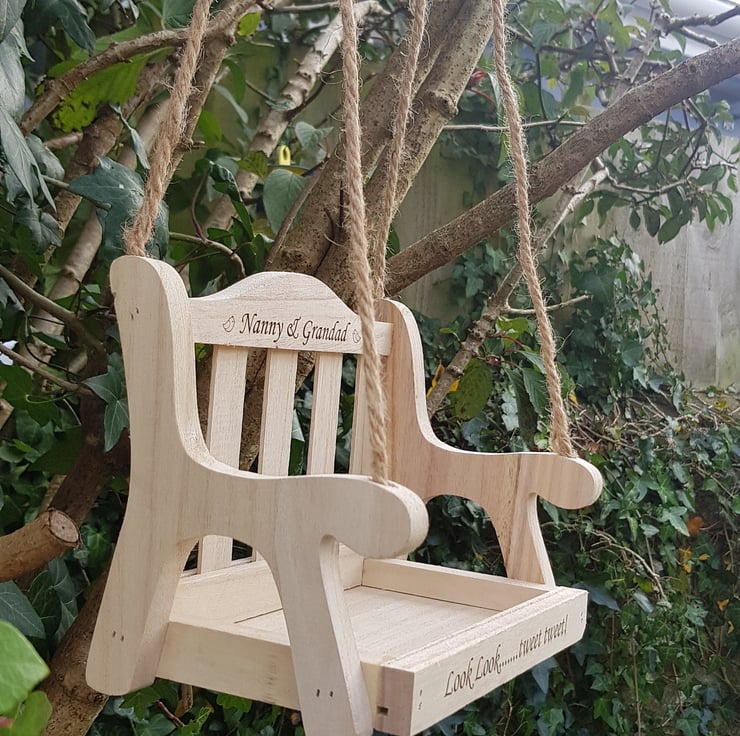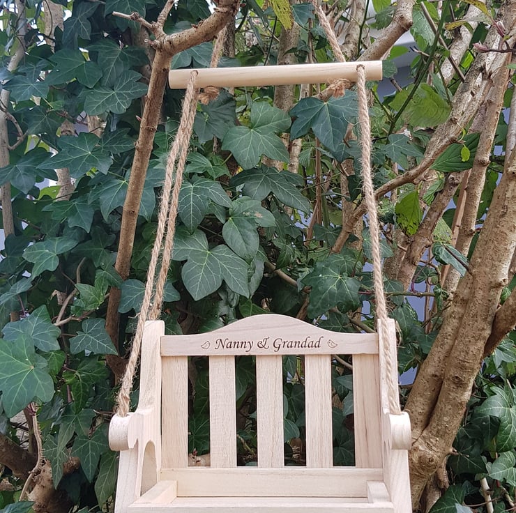 Personalised bird seed swing bench, wooden chair, nanny garden, engraved sign,
