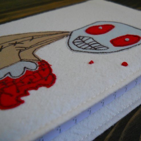 this embroidered notebook features a scary brain-eating zombie on the front cover.