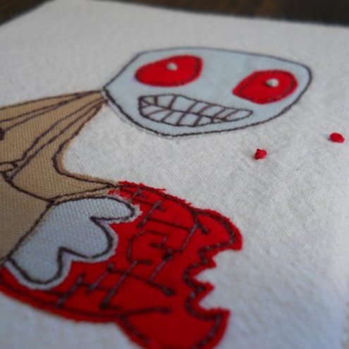 the zombie is in cotton fabric which is appliqued onto pre-washed calico, before being "drawn" on with free machine embroidery, and features hand embroidered eyeballs and blood.