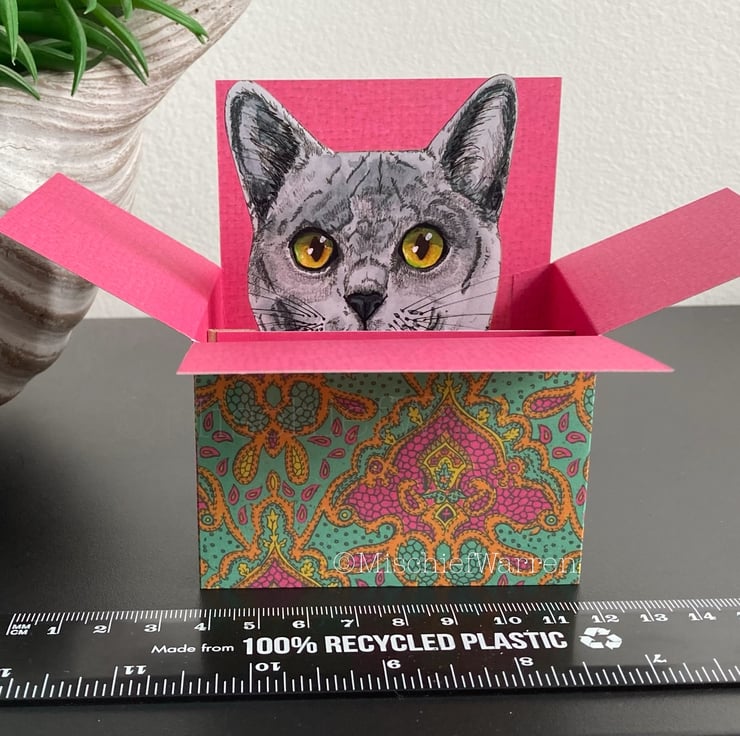 Chartreux, blue British shorthair or Korat cat card. This cute 3D cat card features a recycled kraft card “box” with a silver grey cat peeping out. The Cat in a Box cards are designed and created entirely by me. This cat in a box card features my grey cat illustration with yellow eyes.