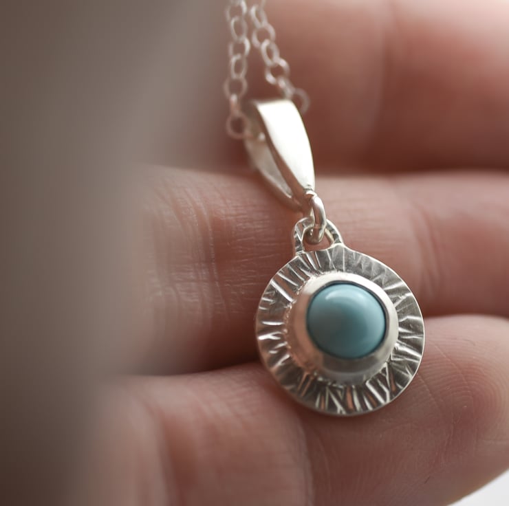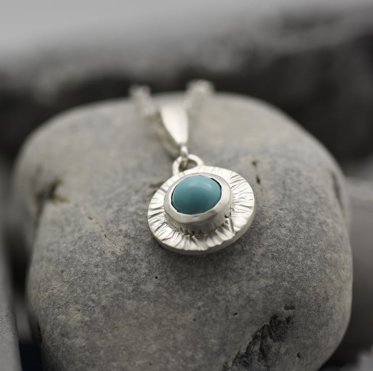 Handmade from Argentium Silver, this lovely modern necklace design is set with a pretty duck egg blue Turquoise cabochon. Suspended on a Sterling Silver chain the pendant is a petite and pretty minimalist piece. Texture has been added around the gemstone and the necklace has been finished to a matt polish.