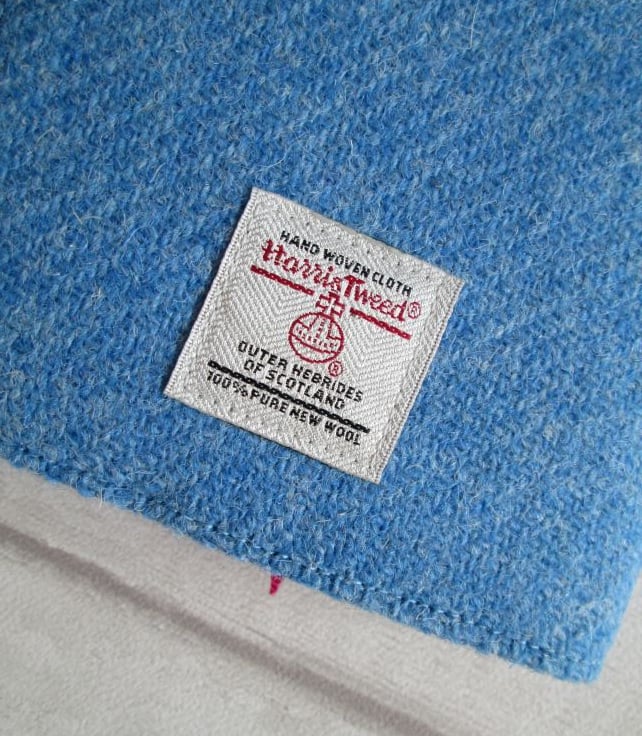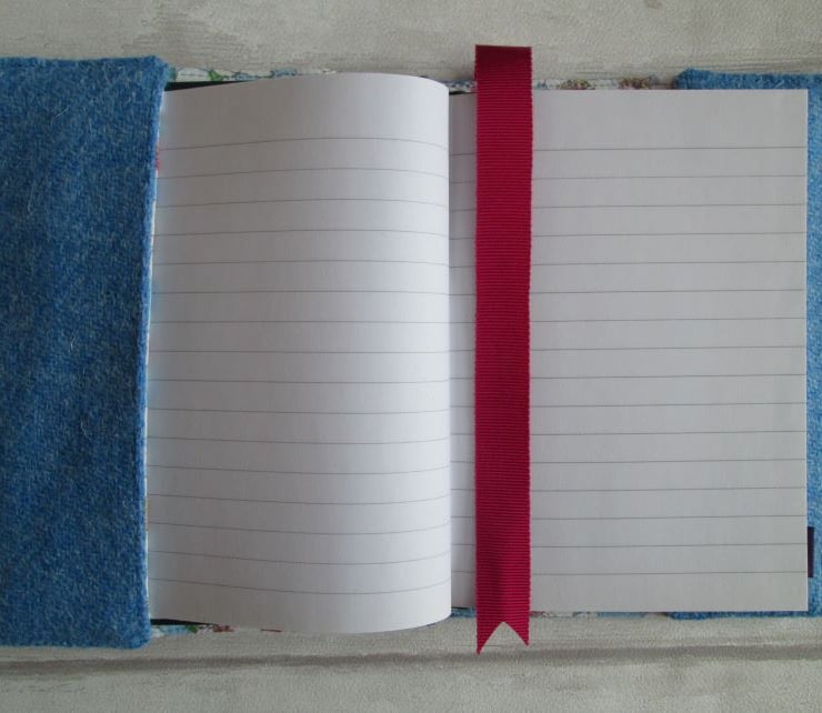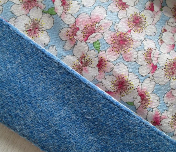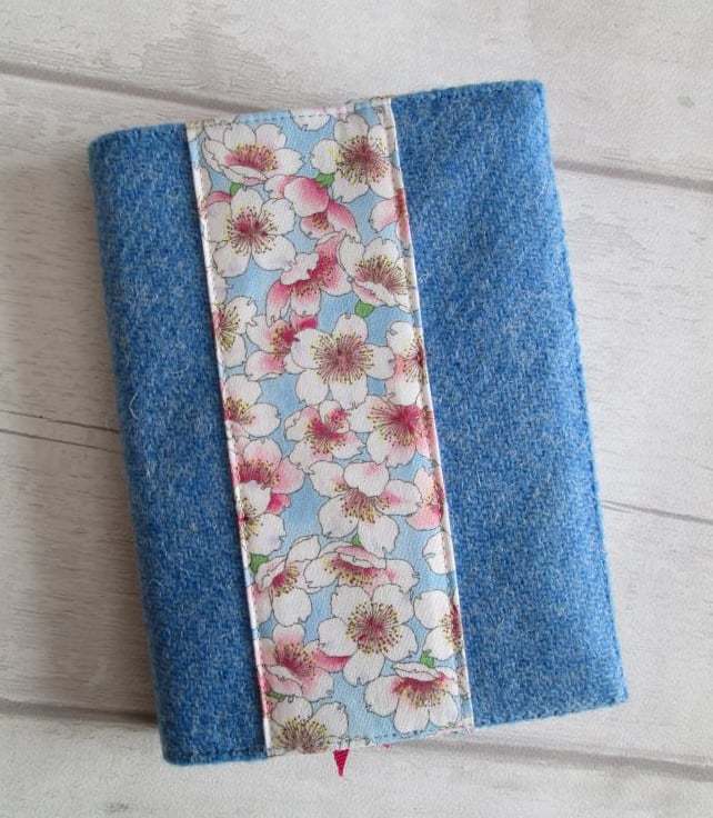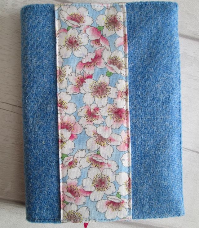 Handwoven by Shawbost Weavers on the Isle of Lewis this beautiful 'Harris Tweed' is the loveliest shade of summer sky blue. I've teamed it with a print of Japanese 'Sakura' or cherry blossom for both the feature band and lining and added a cerise pink ribbon place marker. On the back of the cover you'll find the 'Harris Tweed' label which guarantees the authenticity of this heritage cloth.