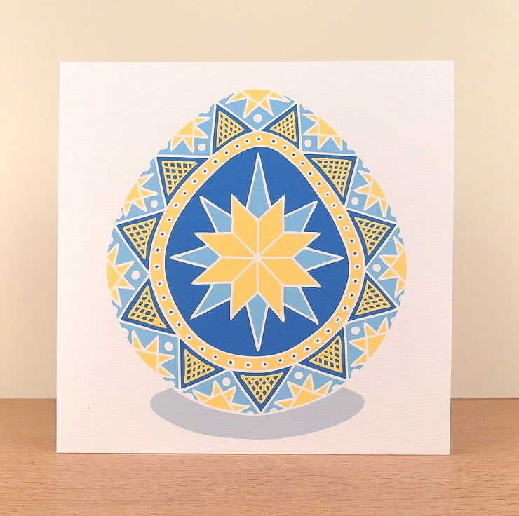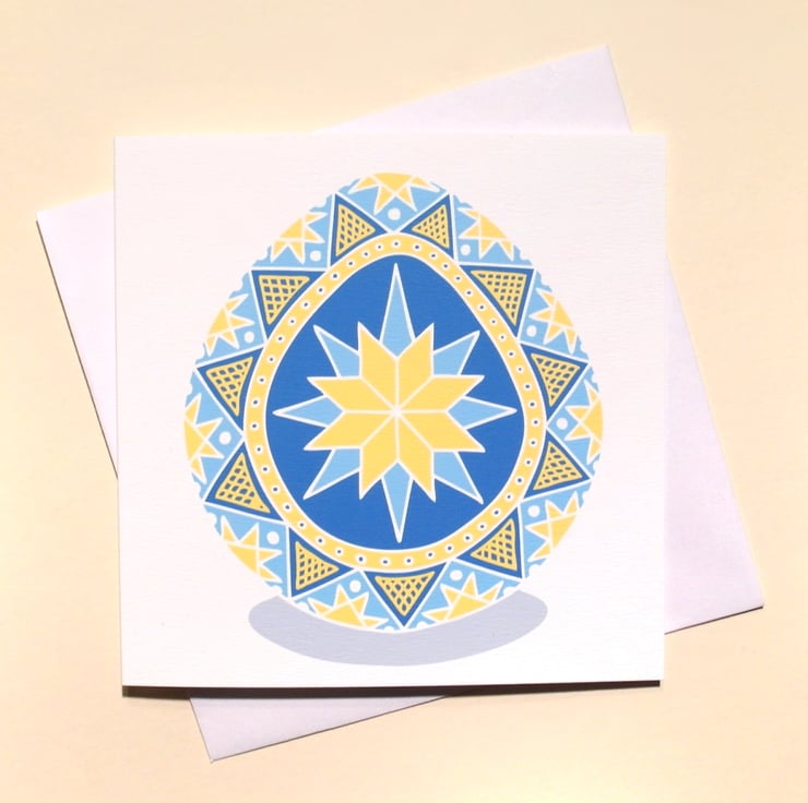 The colourful egg design by Kim Onyskiw is printed on a 14cm (5.5") square white card with a 270gsm weight, and comes with a white envelope. Both the card and envelope are 100% recycled. The Ukrainian style card will be packaged in a bio-degradable and compostable vegetable starch bag to keep it protected in the post.