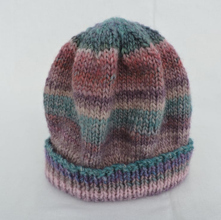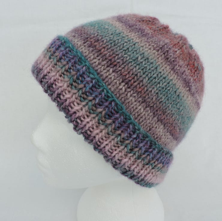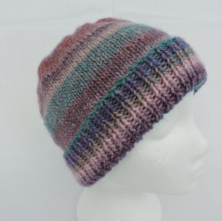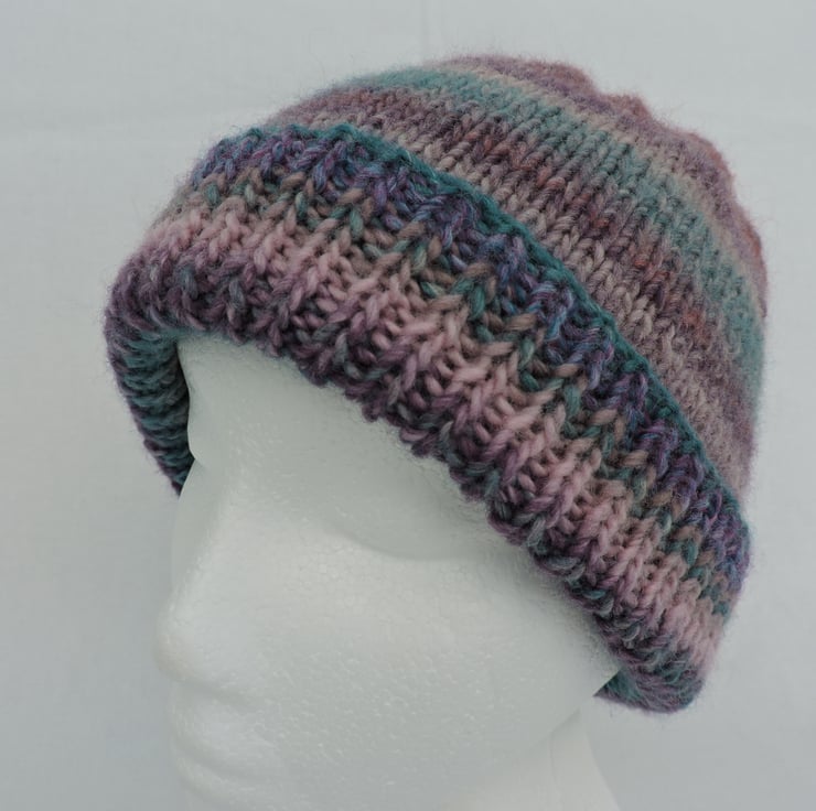 Clearance Sale now £5.00 This adults beanie hat has been knitted using a chunky self striping wool and acrylic yarn. Lovely soft dusky colours of pinks, purple and aquamarine. The body of the hat has been knitted in a stocking stitch with single rib knitting for the brim. Soft and warm making it a perfect winter warmer to keep you snug in the cold weather.