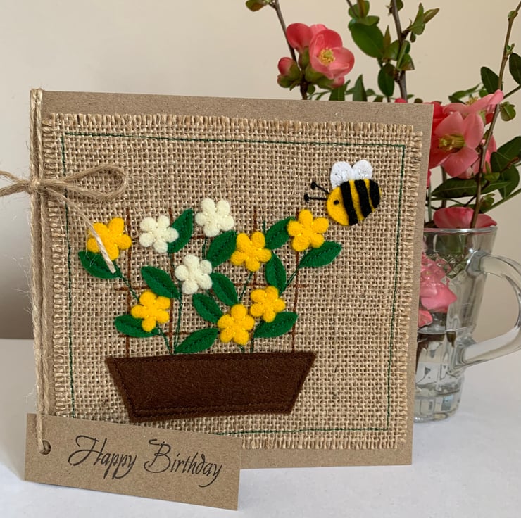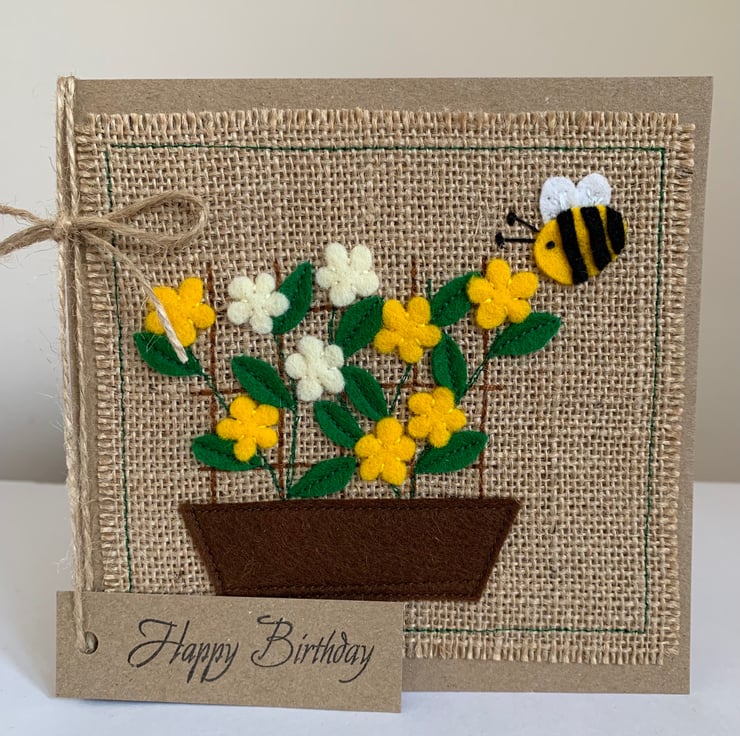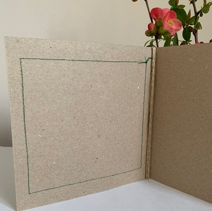 The hessian is machine stitched using a contrasting thread, onto a plain brown recycled card. This stitching is visible on the inside of the card.