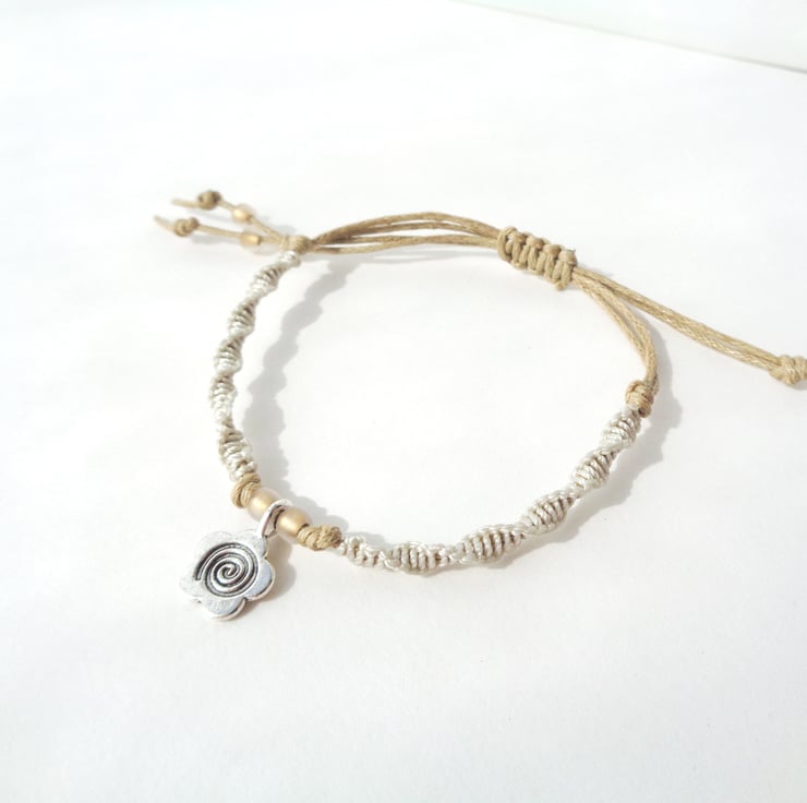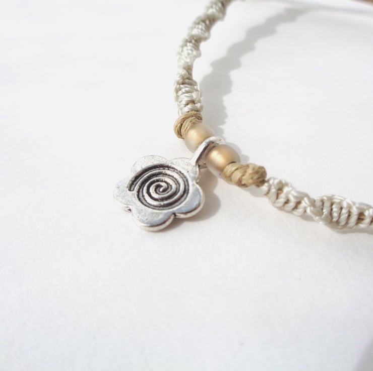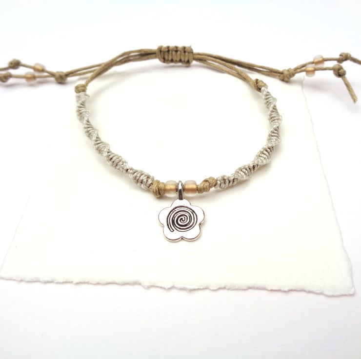 Made form durable neutral cotton cord with spiral macramé over, this is a lovely Tibetan silver flower charm with beaded accents and an adjustable sliding knot clasp.