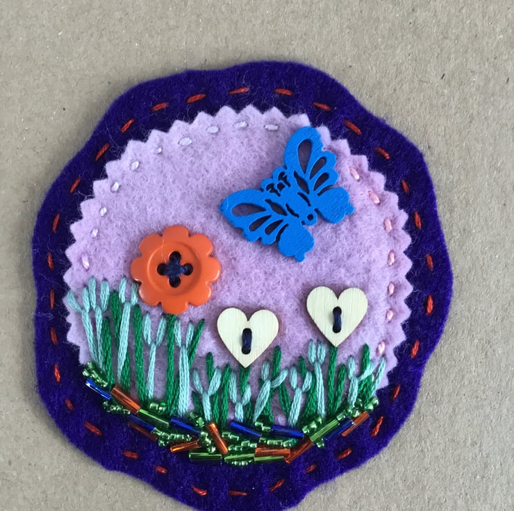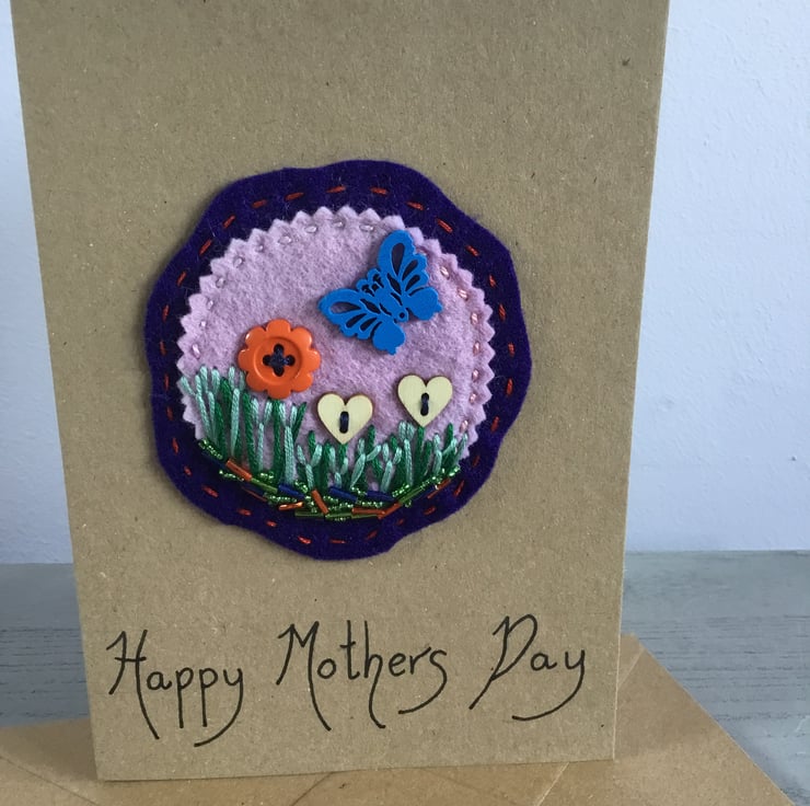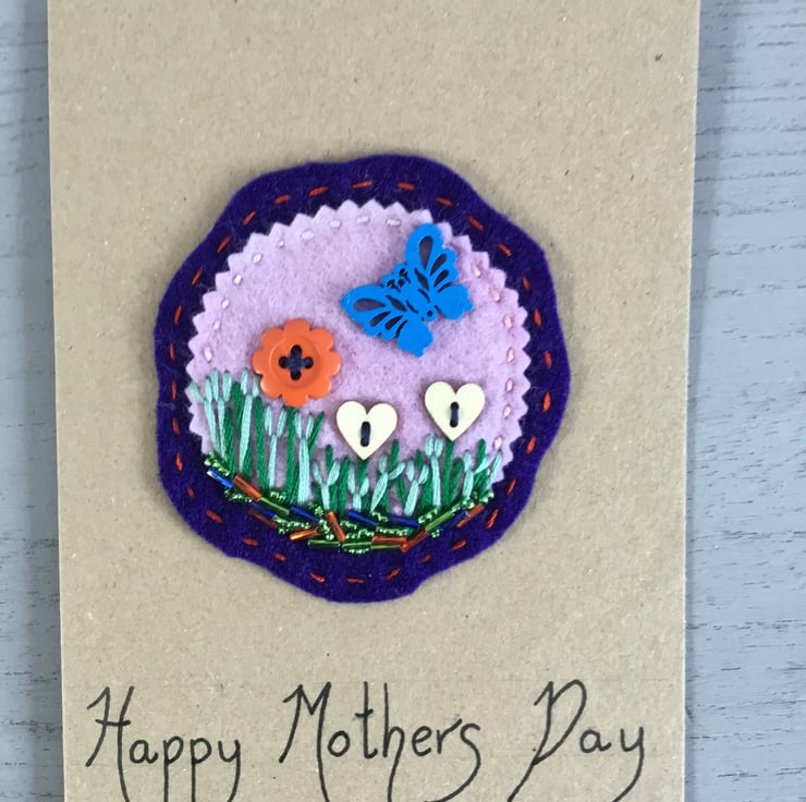 This Mothers Day Card has a hand embroidered border of flowers. A flower button and 2 heart buttons sit in grass, embroidered in Fly and Long Stitches, embellished with seed and bugle beads. A blue wooden butterfly hovers over the flowers. A hand written message Happy Mothers Day is written below. The card is left blank inside to continue the message....