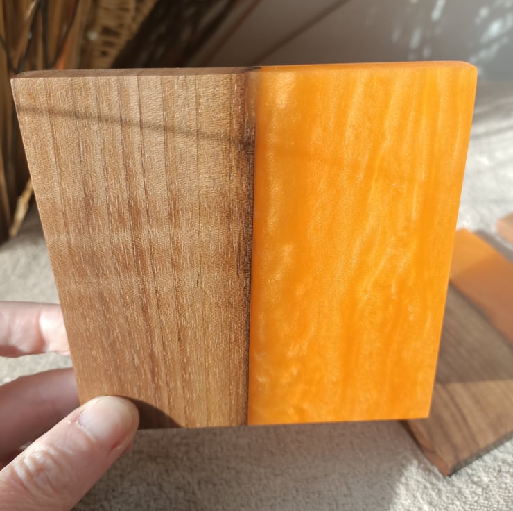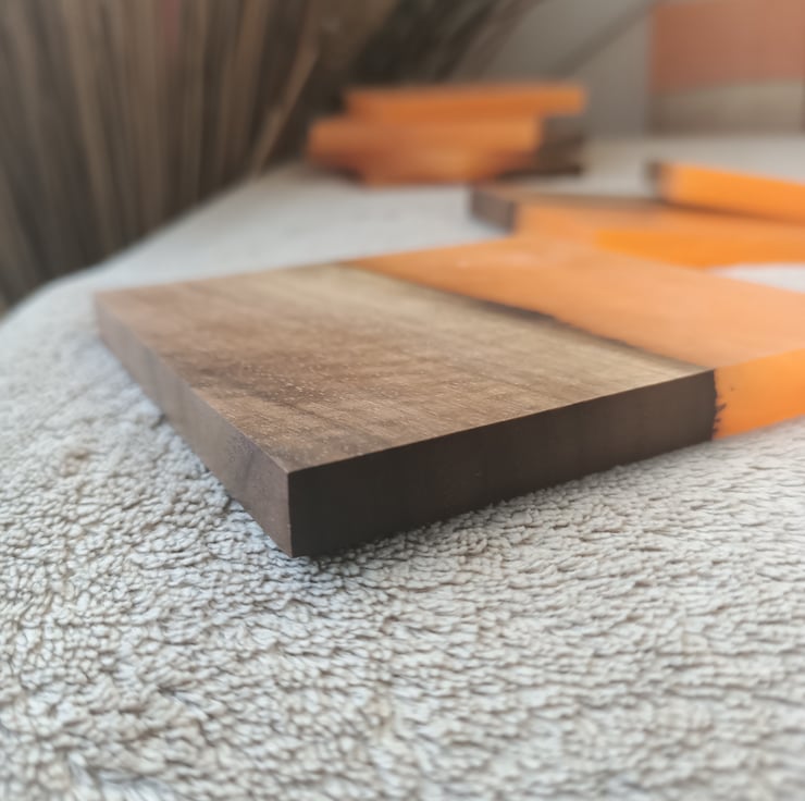The orange resin is bright and contrasts perfectly with the dark rich chocolate colours of the walnut wood.