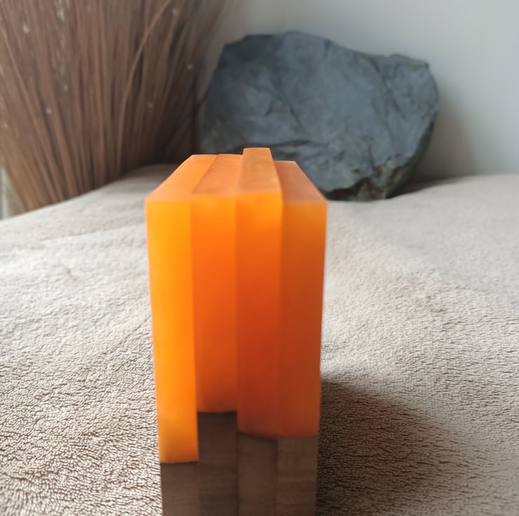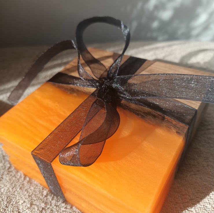 This stunning orange resin and black american walnut wooden coaster has been designed and handmade by Jamie. Each coaster has came from the excess of our coaster range and instead of discarding the extra pieces we have put them together to make a wonky set. The coasters are all different by mm, however this makes this set completely original and a little bit of fun!