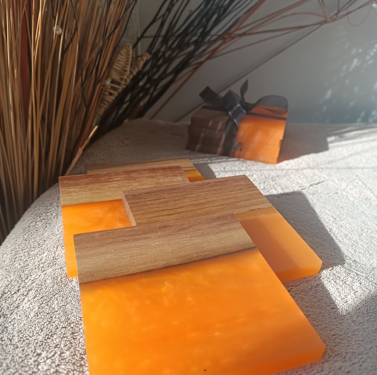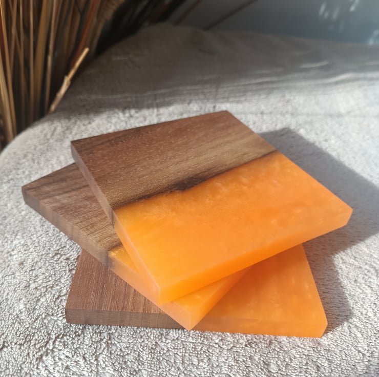 Wonky Walnut coaster set of 4 orange resin and walnut wood.
