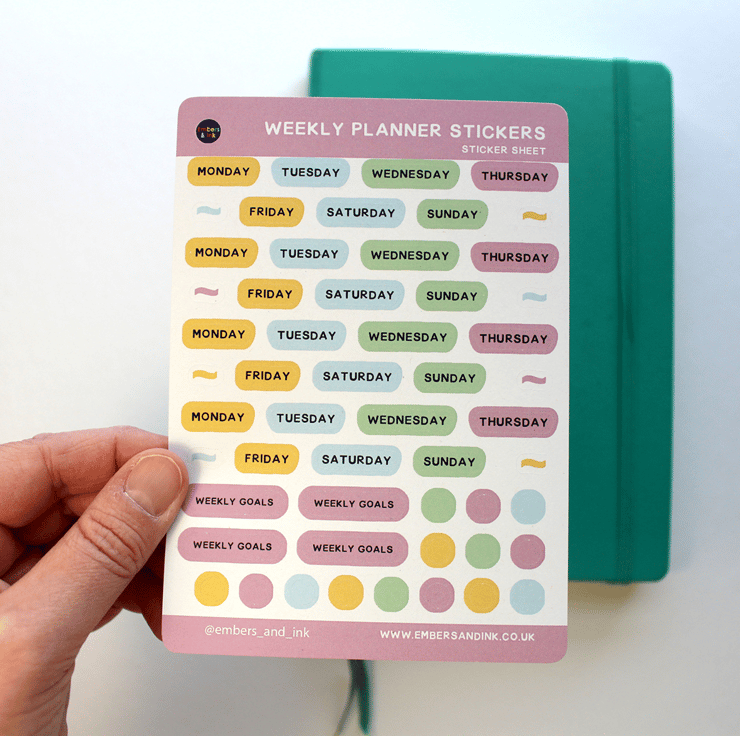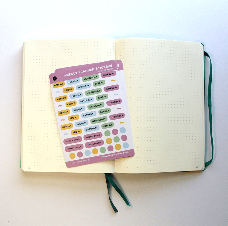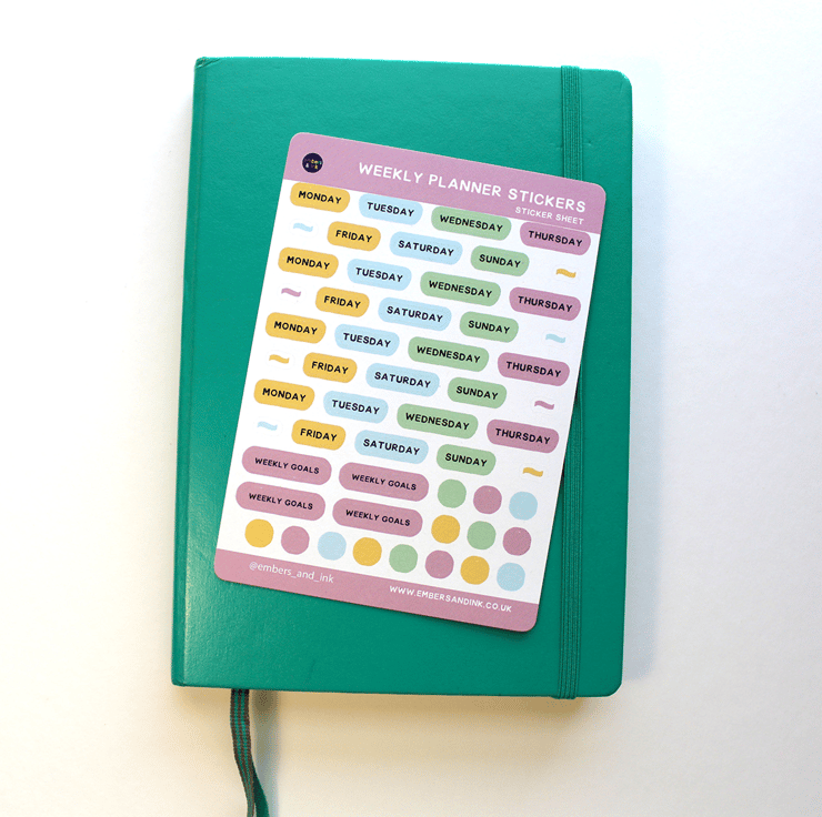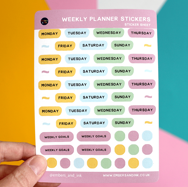 Perfect for bullet-journalling! Decorate your calendar, planner or journal with these cute Weekly Planner stickers to keep you organised. With four sets of the days of the week, four weekly goals stickers and loads of decorative dots and flags, your journal will be the best looking journal around!