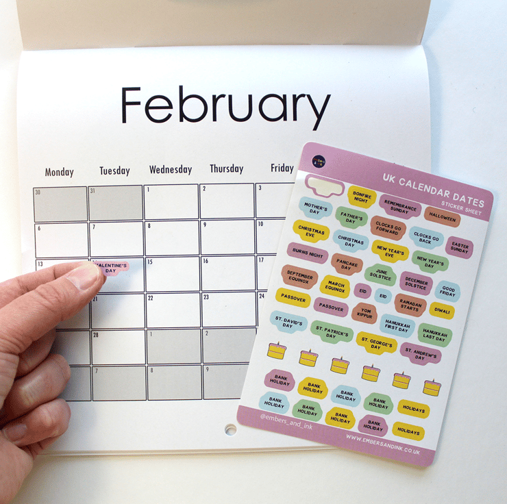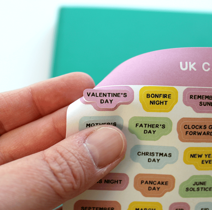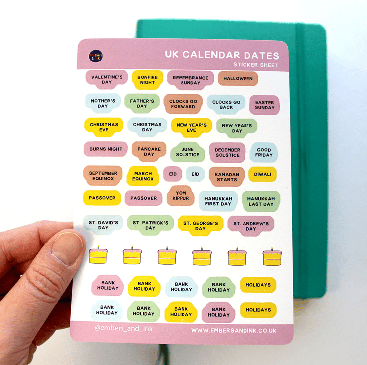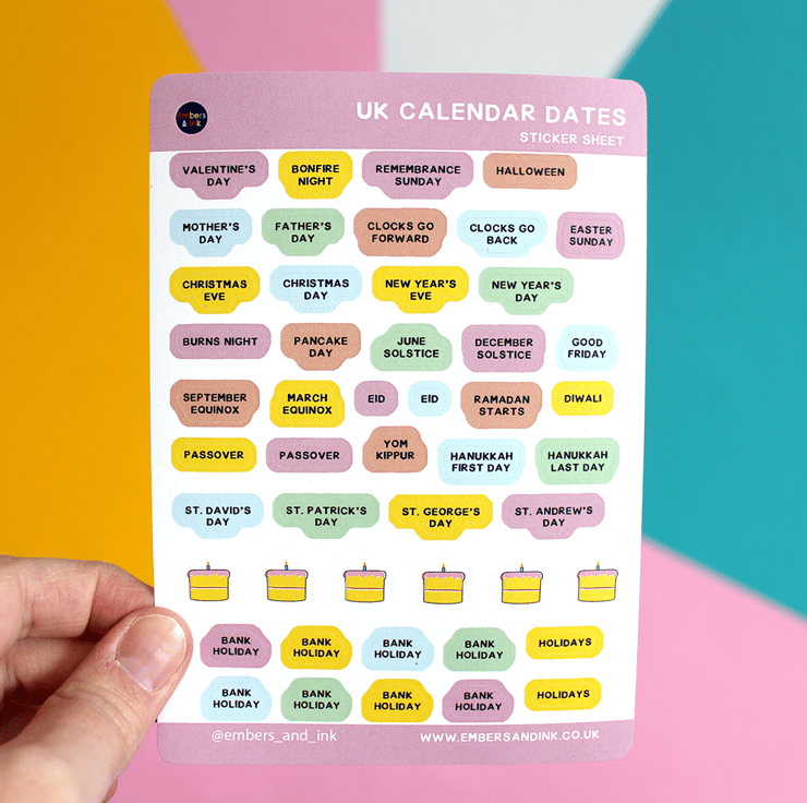 Decorate your calendar, planner or journal with these colourful UK Calendar Dates stickers! This sticker sheet is full of cute and colourful UK holidays such as Valentine's Day, Halloween and more!