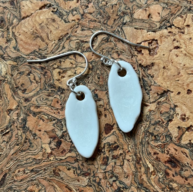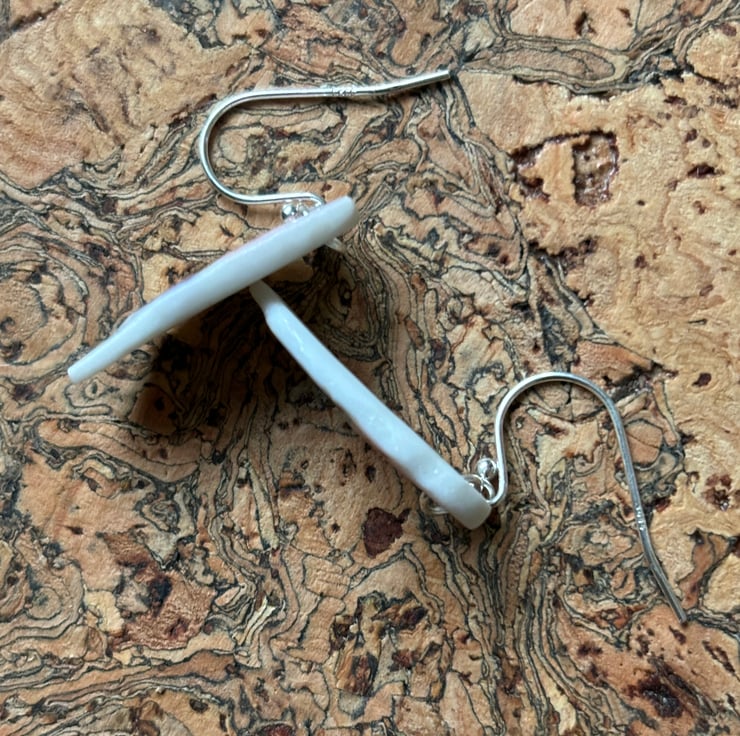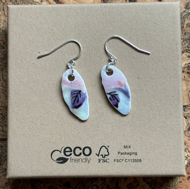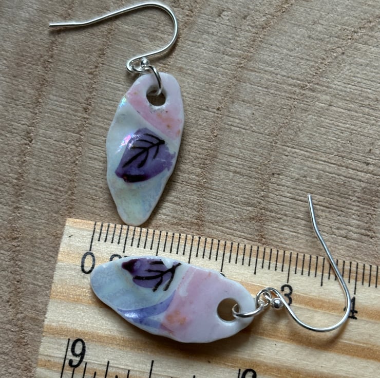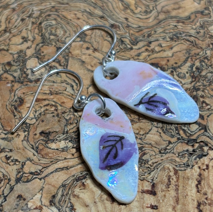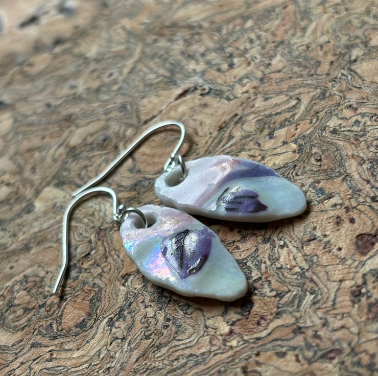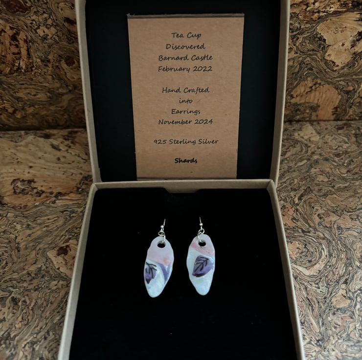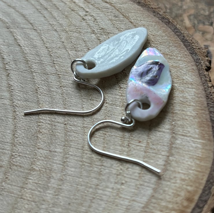 These earrings are made from a small damaged tea cup, thin hand painted ceramic. The shards came from the top of the cup which had a pronounced pattern with iridescent colour, you can see the damage to the glaze but I have sanded and sealed to preserve it. Completely individual but make a striking pair. Once a very damaged cup destined to be thrown away, now start life as earrings.