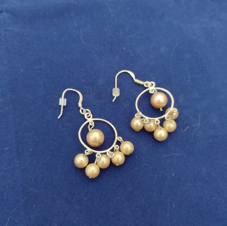 Sterling silver earrings from which are suspended coffee coloured crystallized pearl beads. The fish hook earwire is sterling silver. The earrings measure just over 3 inches at the longest point.