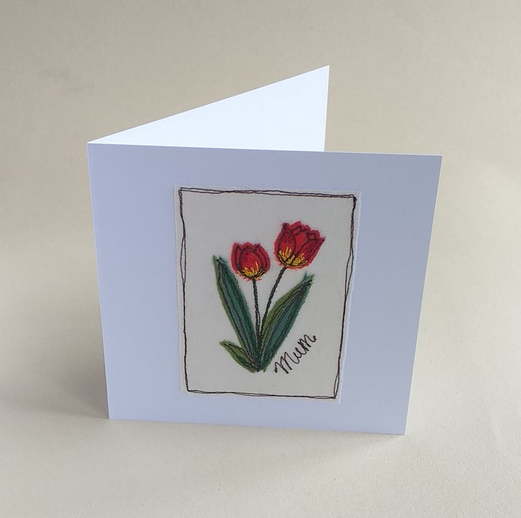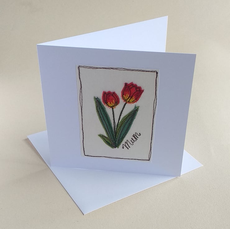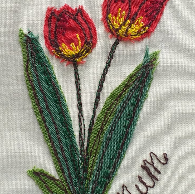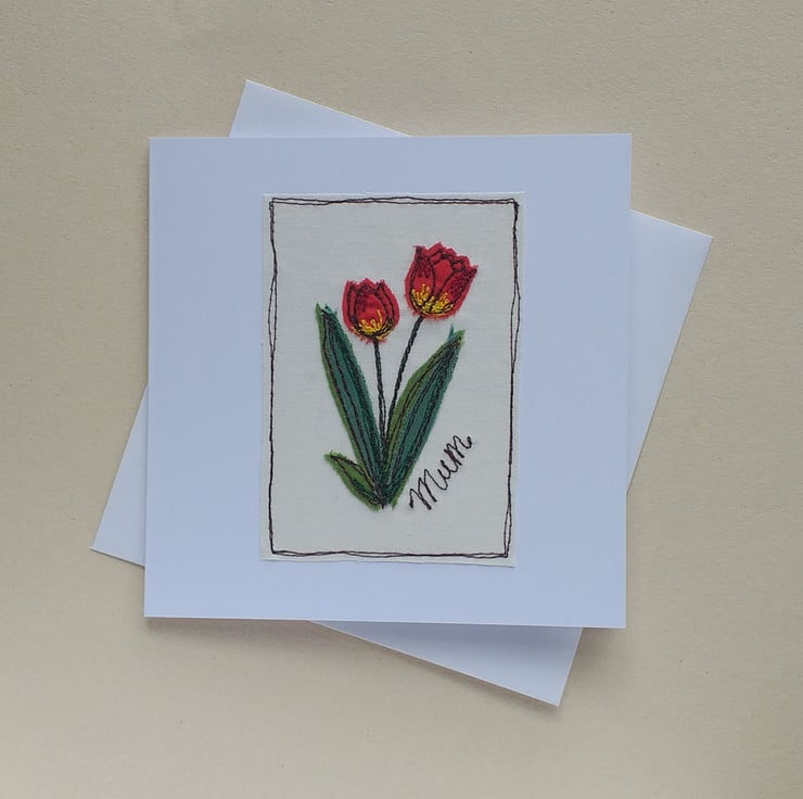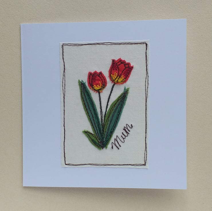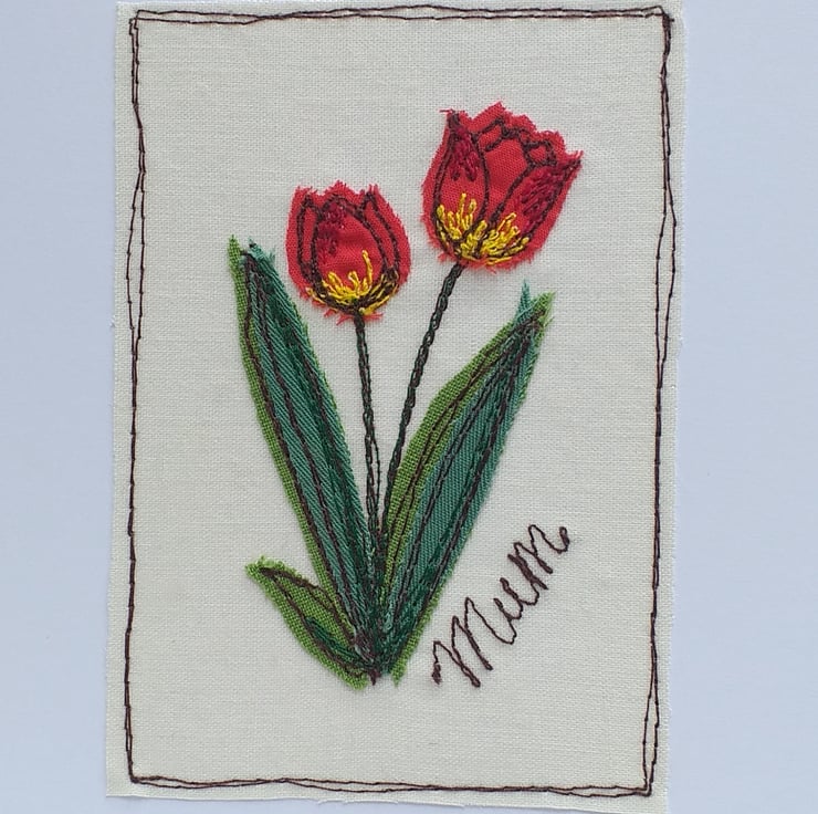 A beautiful, detailed image of two tulips, made by appliqueing snippets of fabric and sewing them onto a cream cotton background using free motion embroidery. The word Mum is embroidered on, and details in different coloured threads. This is a perfect card for Mother's Day or for Mum's birthday.
