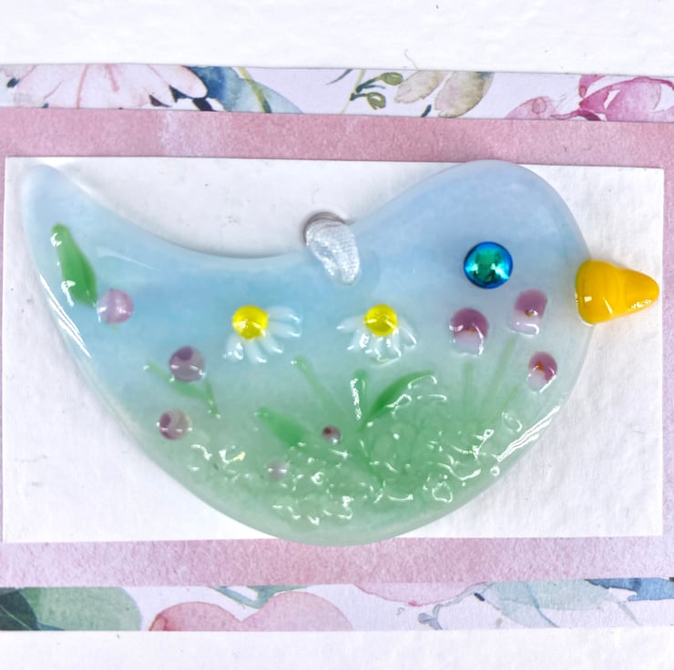 A lovely handmade card with a gorgeous fused glass bird with pretty pink flowers & daisies attached to it - the perfect card and gift in one!