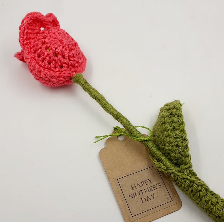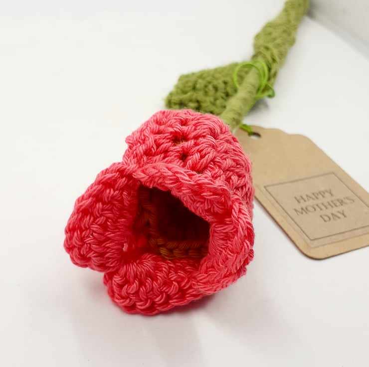 This bright bloom would make a lovely keepsake alternative to a greetings card. The tulip flower has been adapted from a pattern by Kathryn Senior and crocheted in cotton. The petals are coral pink and it has a mustard yellow centre.The flower head is fixed to a bamboo stem with floristry wire. The stem is wrapped in wool-rich yarn and finally a leaf in the same yarn has been added. The whole flower measures approximately 24 cm tall. The tag reads Happy Mother's Day, although I am very happy to exchange this tag for one with wording of your choice.