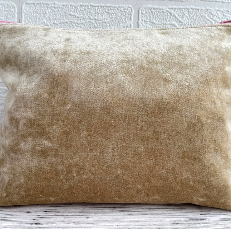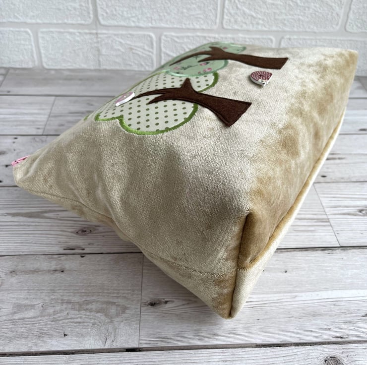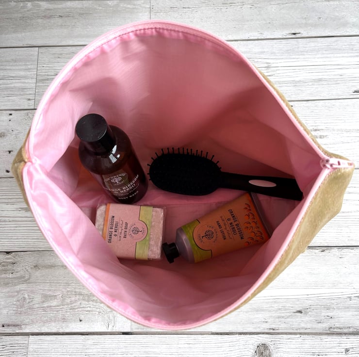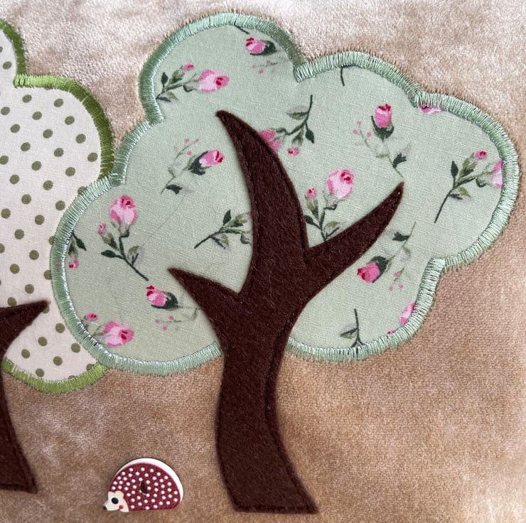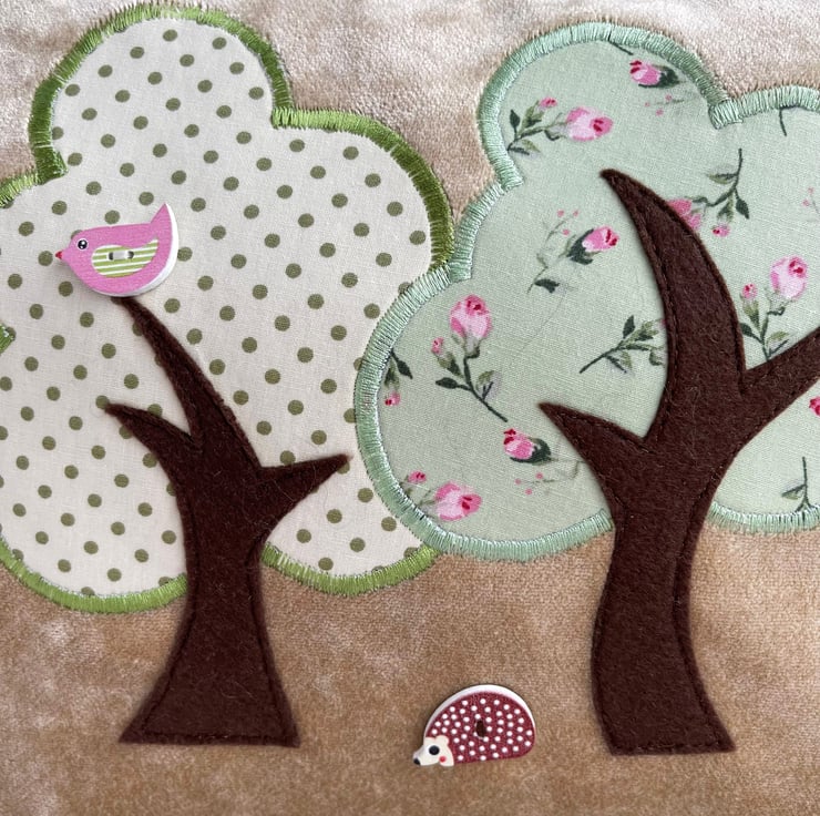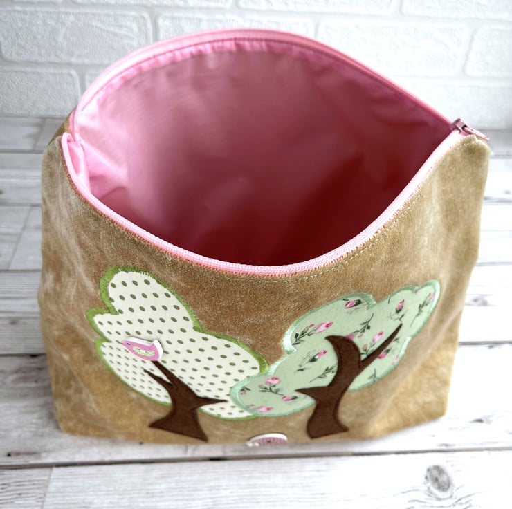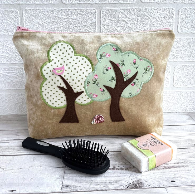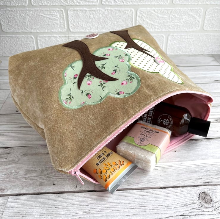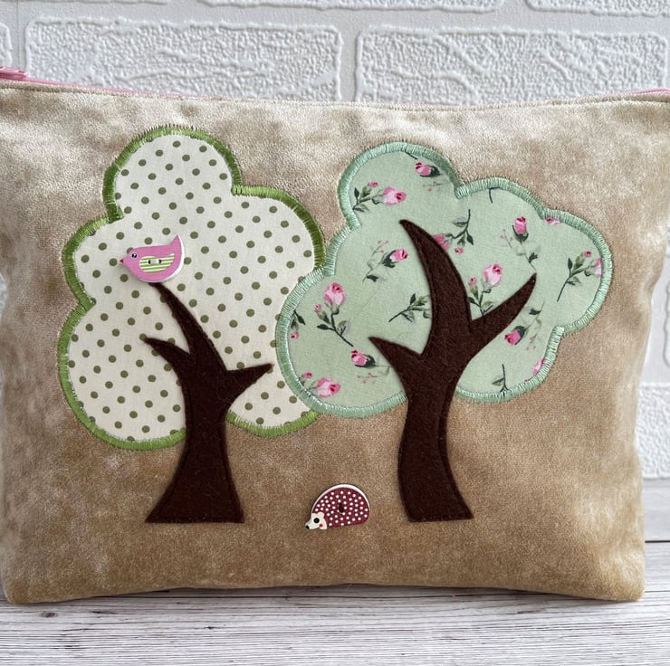 Woodland toiletry bag. This lovely wash bag is made from luxurious beige velvet and features a delightful appliqué woodland scene. I've tried to match all the elements of the design by careful choice of colours and patterns. There are two trees, the tops of which are made from pretty Rose and Hubble print fabrics. One is cream with green polka dots and the other is a floral print in pale green with pink rosebuds. The trunks are made from brown felt. To one branch of the polka dot tree, I’ve added a wooden bird-shaped button in pale pink, with a green and white striped wing. Between the two tree trunks, on the ground, I’ve added a cute wooden hedgehog-shaped button in brown, with white polka dots. The toiletry bag has a pale pink zip and is fully lined with pale pink water-resistant fabric. The base of the bag is boxed to give lots of space for all those essential items.