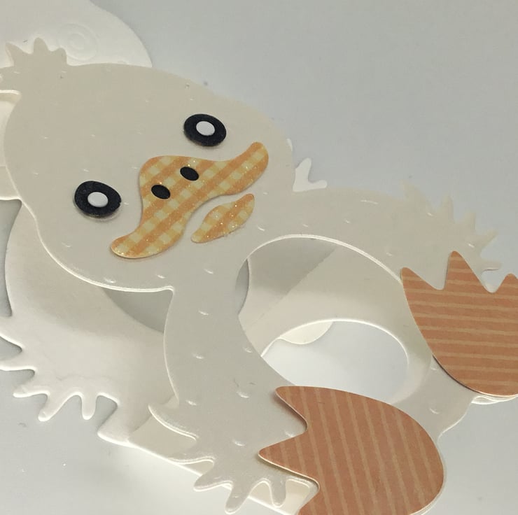 The cute duckling has been brought to life using high quality, cream pearlescent card with a delicately textured polka dot pattern. It’s features have been added using patterned and glittered card stock. Crisp, white card has been used to make the rest of the card, allowing space for you to write a personal message on the back. It will be folded flat for posting.