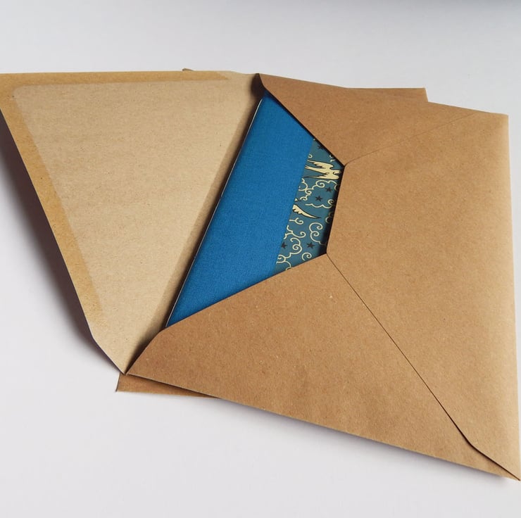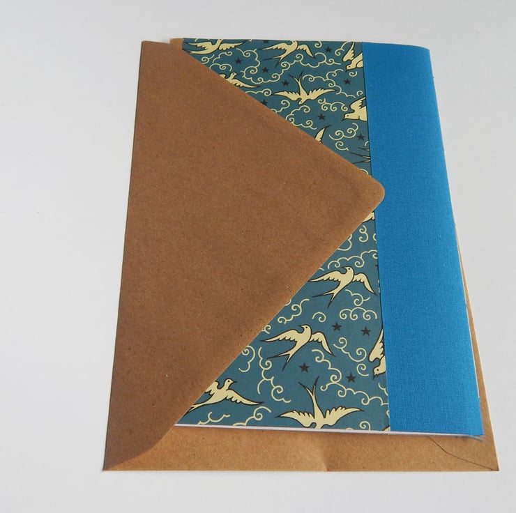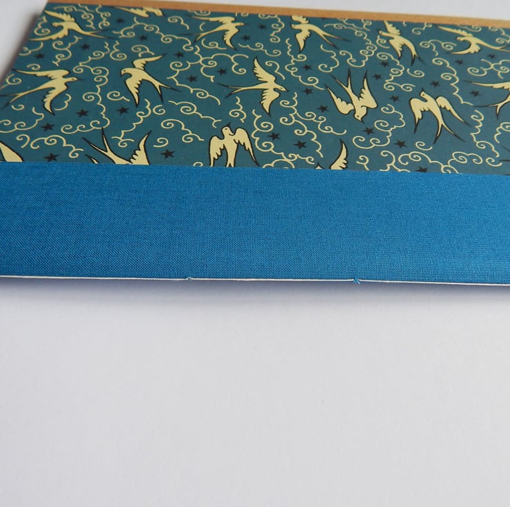 Kraft card covers with blue bookcloth trim and panels of decorative paper in a modern design - "Bluebirds" by Cressida Bell.