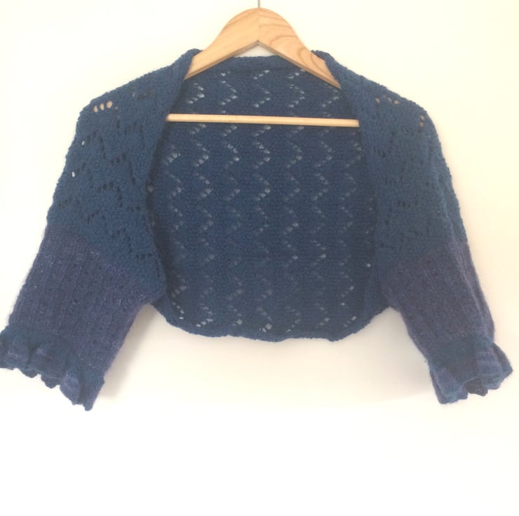 Pretty lace bolero / shrug hand knitted in teal blue alpaca /wool yarn. Intricate zig zag lace pattern with 5" striped ribbed cuff with ruffles.