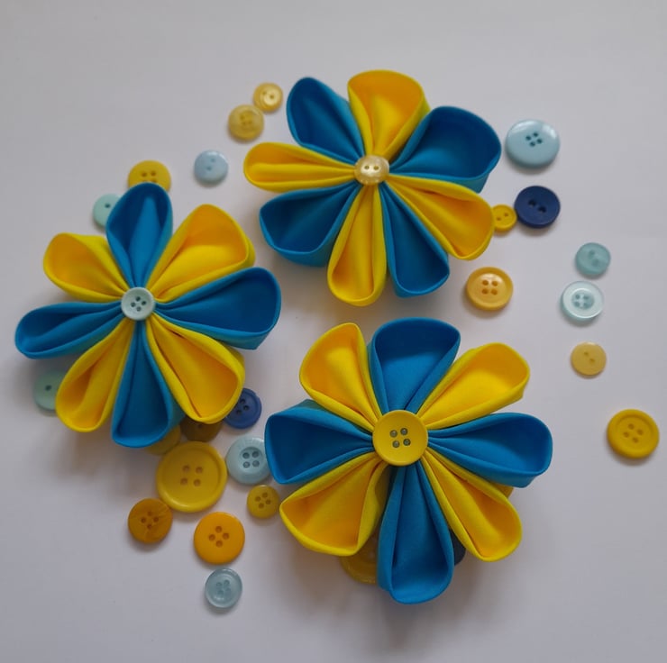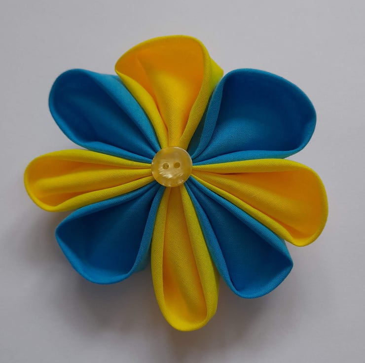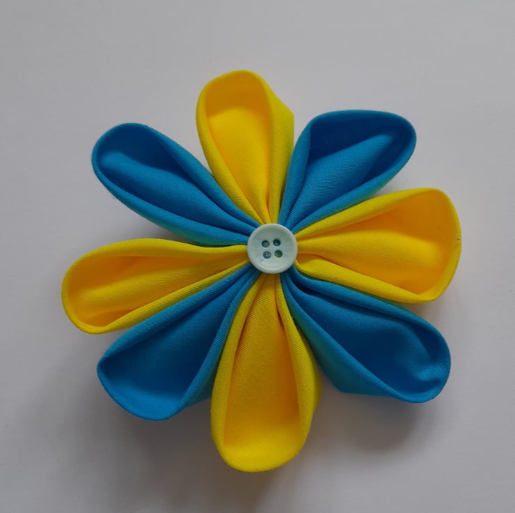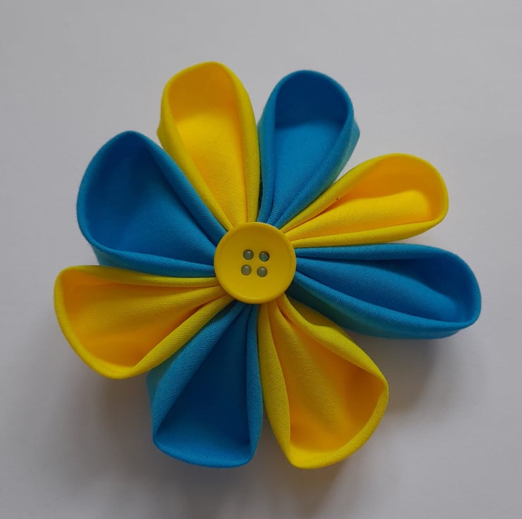 This is a handsewn fabric flower. The flower petals alternate between yellow and blue cotton fabric, the colours of the Ukraine Flag. It measures approximately 4inches/10cm in diameter and has a button centre. The centre button will be a complimentary blue or yellow and there is a 1inch/2.5cm brooch setting on the back of the flower