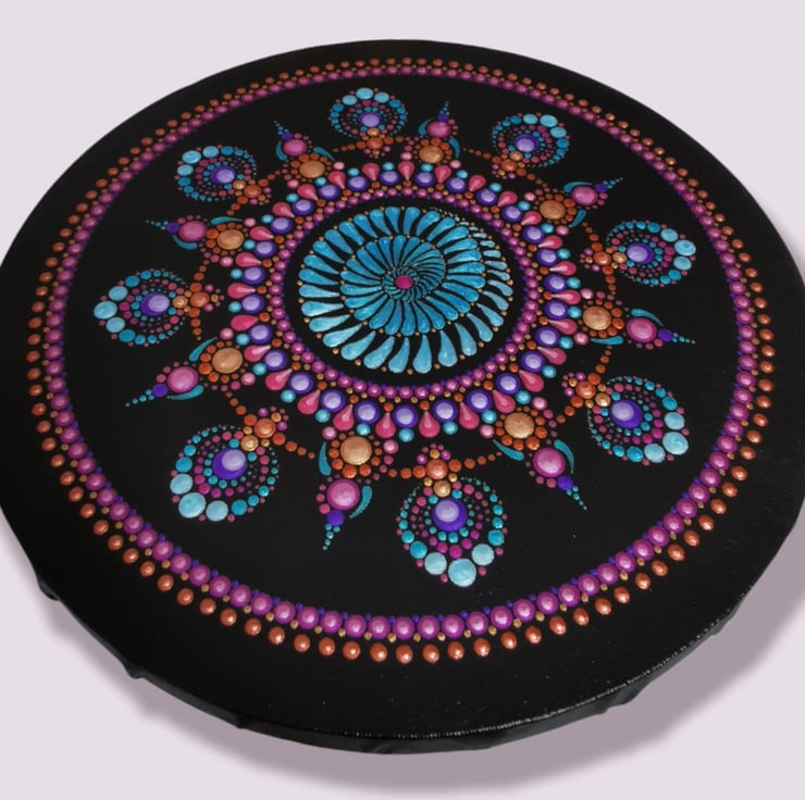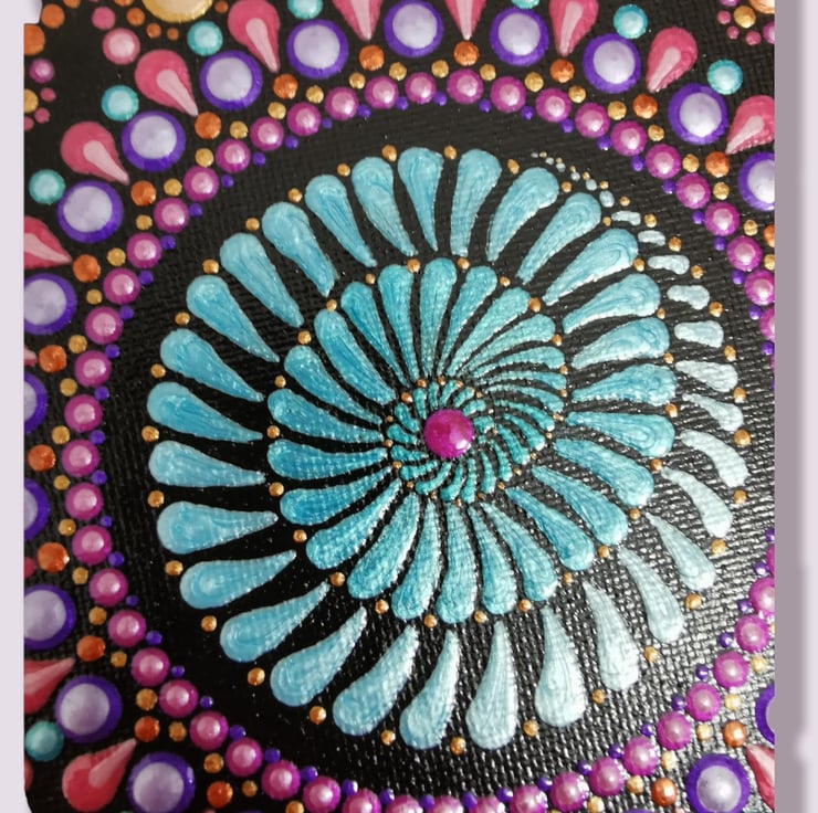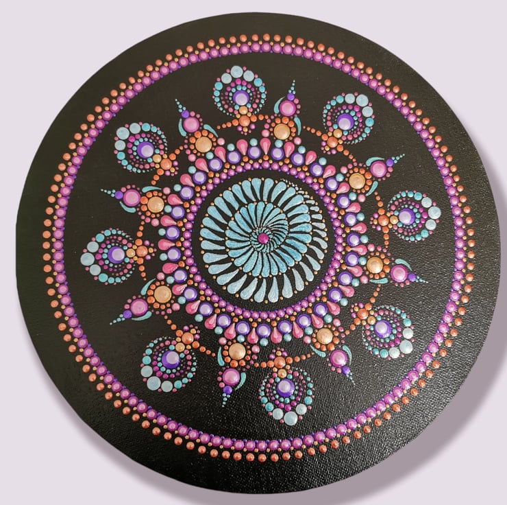 Beautiful hand painted dot mandala 8" round canvas in shades of purple, pink, blue and gold